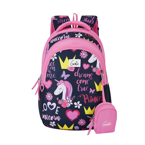 Genie Unicorn Love School Backpack for Girls |15 In-20 Ltr with Three Compartments,Side Pockets and Light Weight with Padded Shoulders |Best for Books,Stationery, Lunch Box & Essentials – Navy Blue