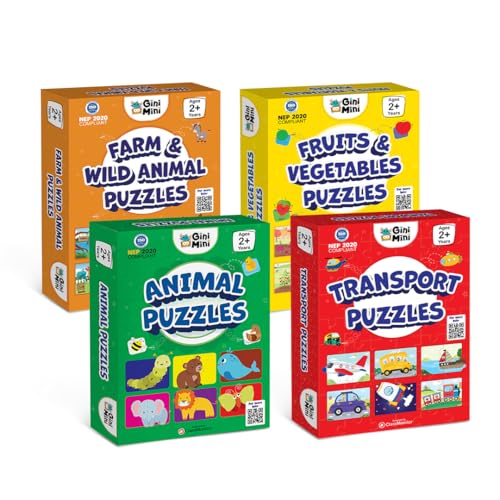 GiniMini Combo Set of 4 Jigsaw Puzzles for Kids | 2-Piece Animals, Transport, Fruits & Vegetables Puzzles | Educational Toy for Cognitive Development | Fine-Motor Skills | Age 1, 2 & Above