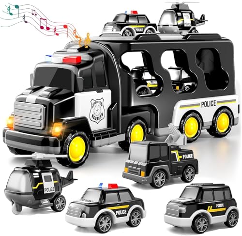 Kidology 5-in-1 Friction-Powered Police Truck Toy Set with Music – Montessori Educational Transport Carrier Vehicle Toy for Boys & Girls, Fun Birthday Gift for Kids Ages 3+