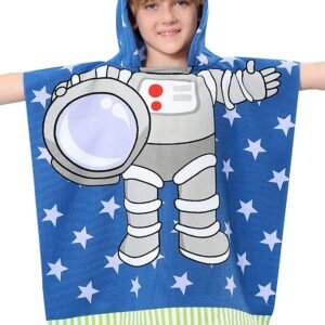 W2S Printed Hooded Poncho Bath Towels for Kids. Soft Absorbing Cartoon Printed Towels Full Size. 0-6 yrs, Size: 60×120 cm. (Astronaut)