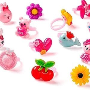 TAHERA Kids Rings for Girls,Gift for Birthday, Fancy Cartoon Finger Ring Set with Pink Heart Shape Box, Kid Play Toy with FREE Bracelet Inside (36 rings + 1 bracelet)