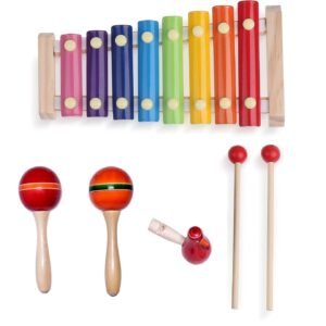 Wooden Montessori Maraca Rattles & Musical Bird Whistle Set – Colourful Musical Instrument Rattle Toy for Baby and Kids (0-3 Years) – Non-Toxic, Hold and Shake Toy