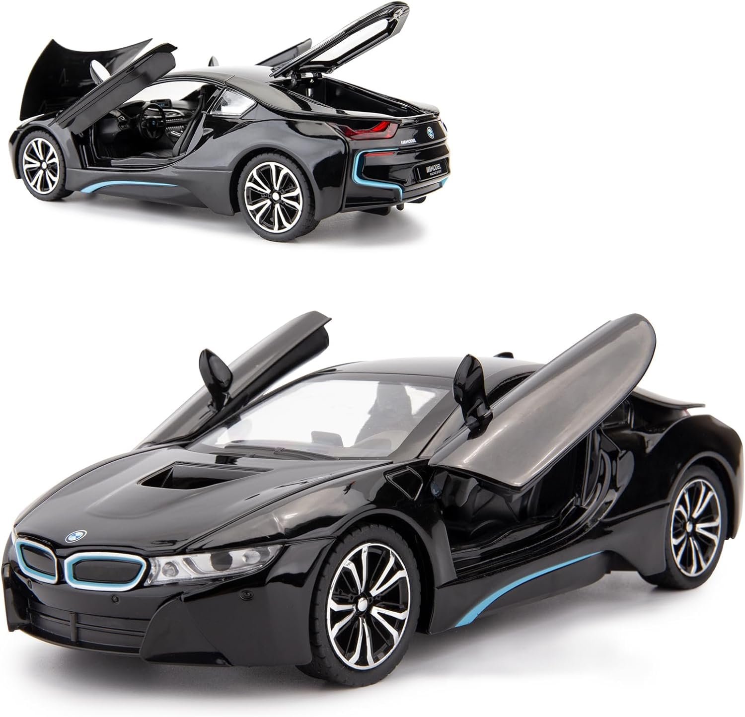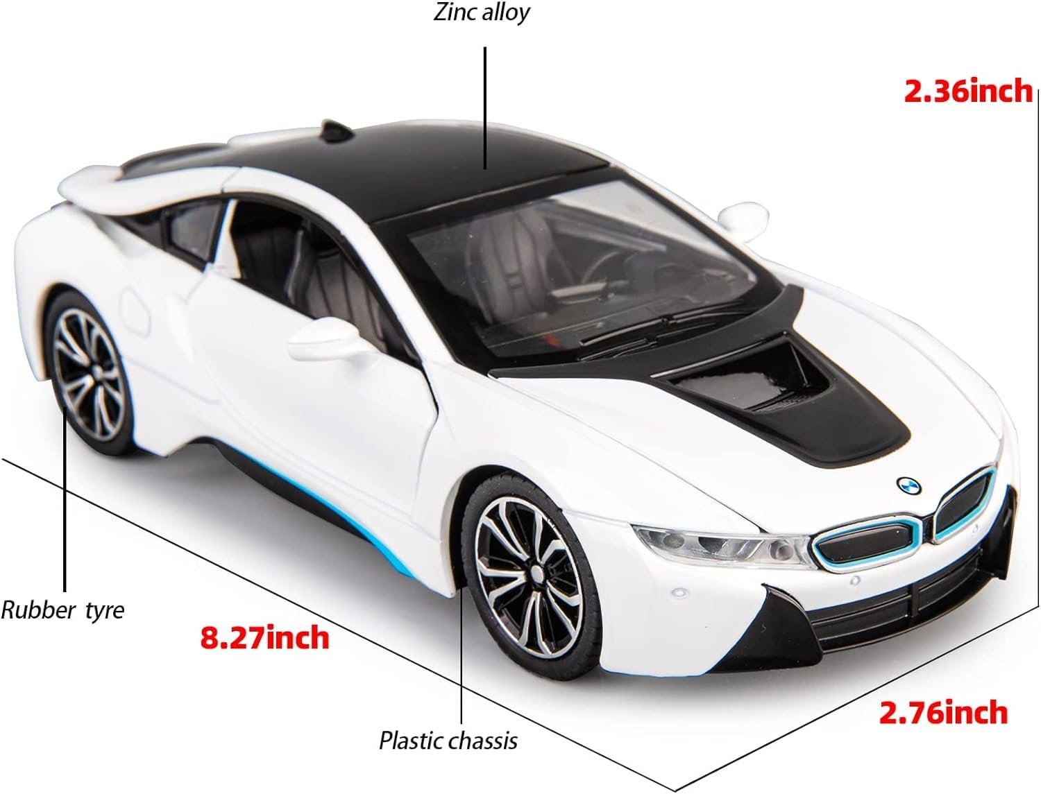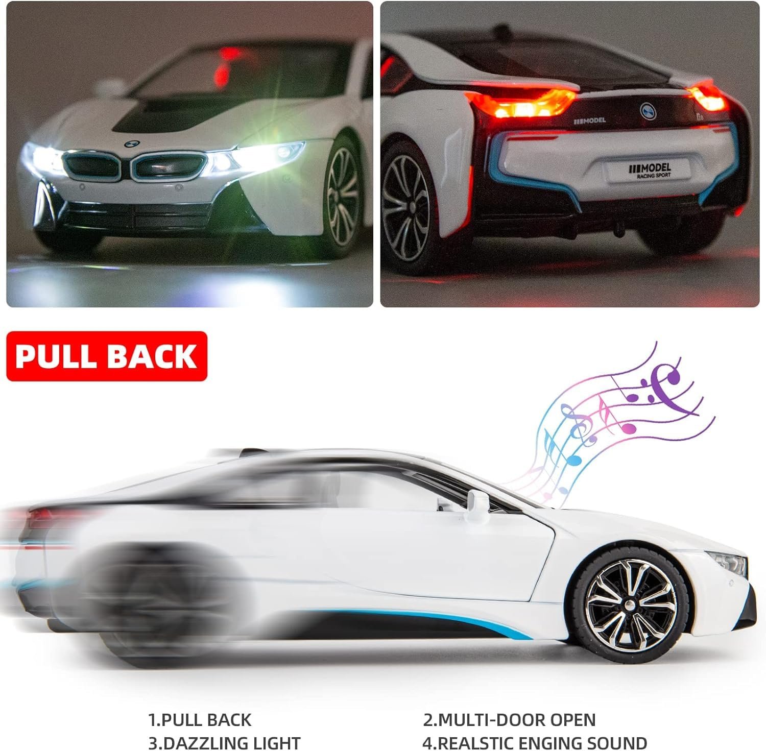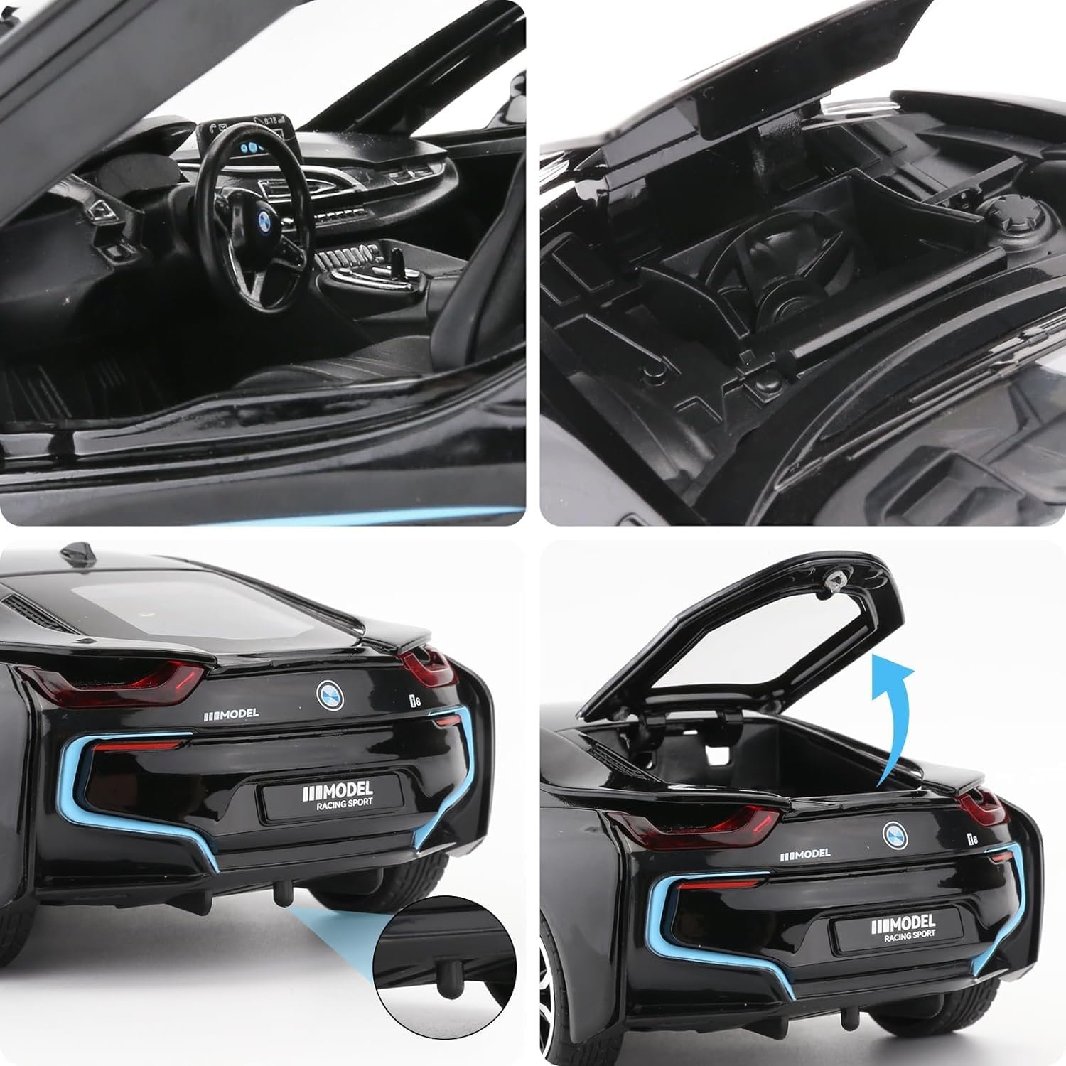 1:24 Diecast Model Alloy BMW I8 Metal Pull Back Car with Sound & Light, 4 Openable Doors, Toy Car for Kids Gift [B M W I8-Black]