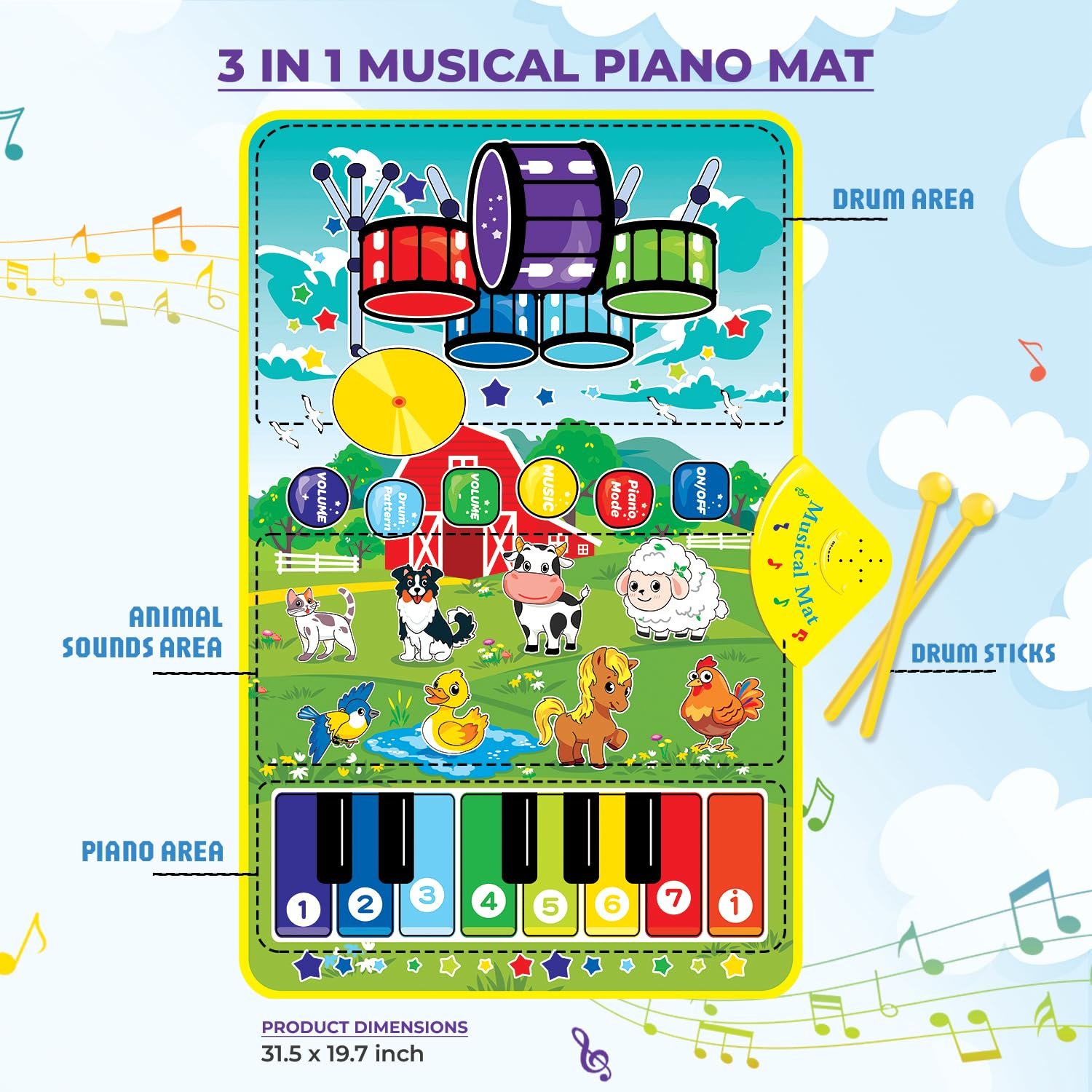 【MULTI-FUNCTIONALITY】A versatile 3-in-1 musical play mat that combines the fun of drumming, playing a piano-style keyboard, and pressing keys to produce engaging sounds from various birds and animals (cat, cow, bird, duck, dog, horse, sheep, and rooster). It also includes 13 demo children\’s songs, offering a wide range of musical activities to keep toddlers aged 1 and above entertained and engaged.