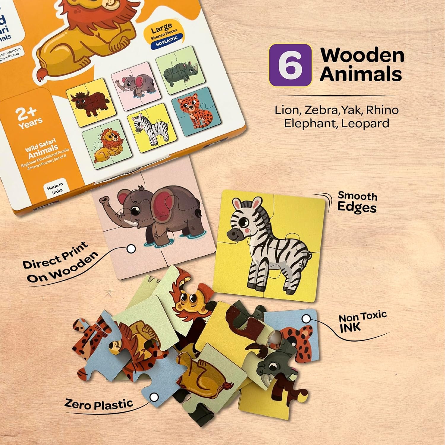4 Piece Wooden Puzzle Set of 6 – Wild Animals – Kids Toys for 2-5 Years Boy – Educational Pre-School Toys, Safe & Durable, Zero Plastic, Vivid Printing