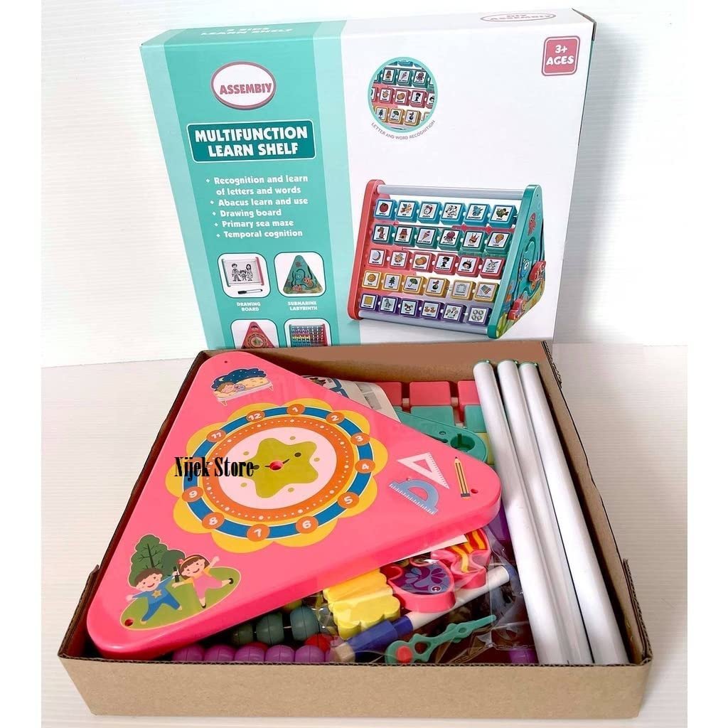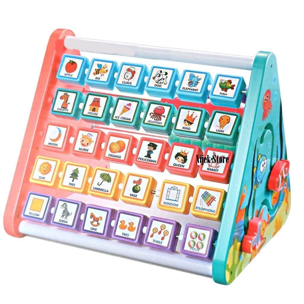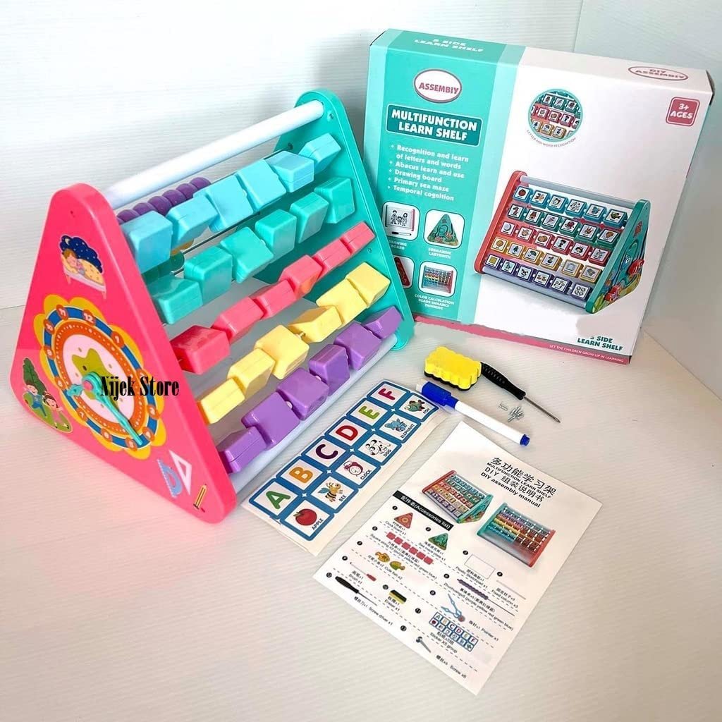 Multifunctional Learn Shelf : Flipping 26 alphabet blocks and four numbers blocks with pictures and English words, abacus, clock, zig zag sliding fish at 4 sides and white board at the bottom. One of the best activity toys for toddlers