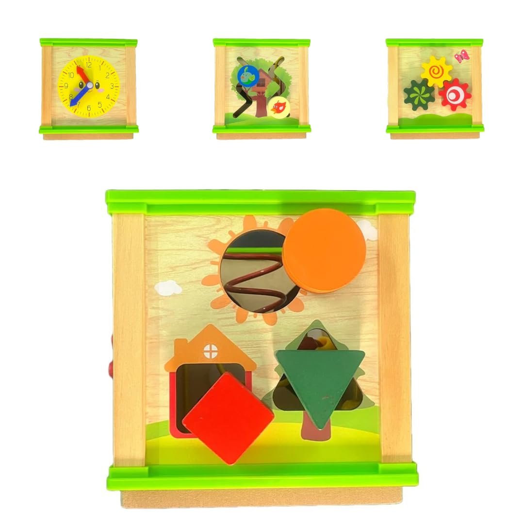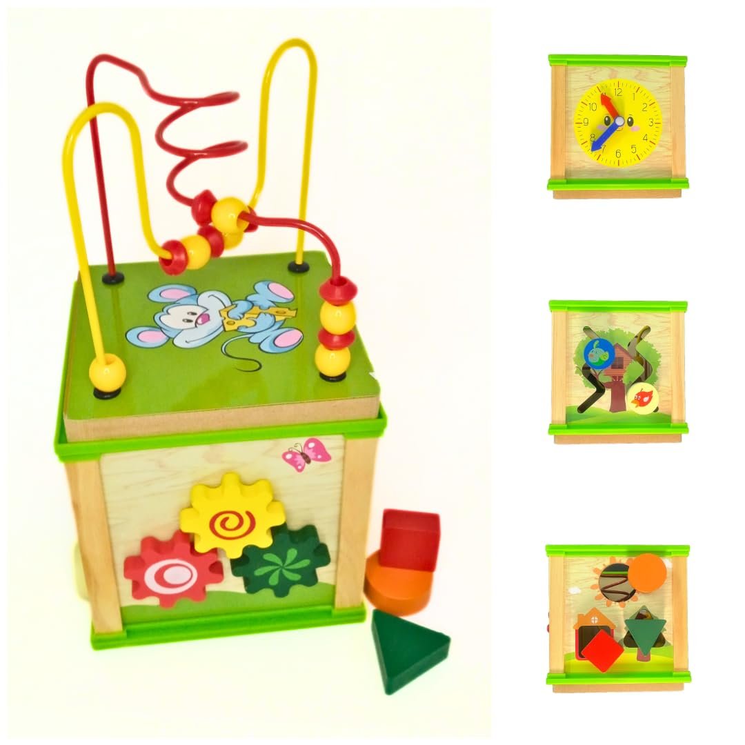 5 in 1 Montessori Themed Activity Cube for Kids 1-4 Years (Beads Maze + Colourfull Clock + Gear Wheels + Shape sorter + Routing Insects)