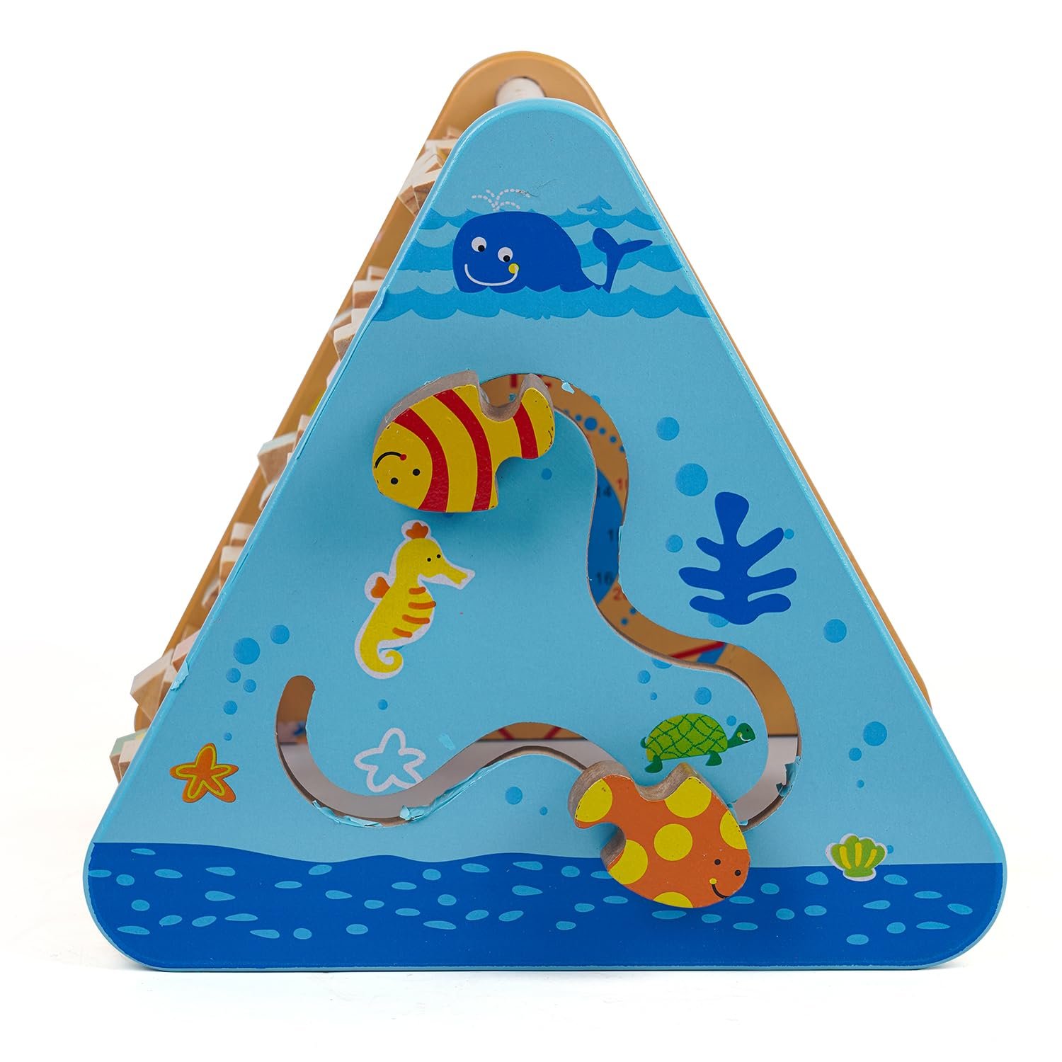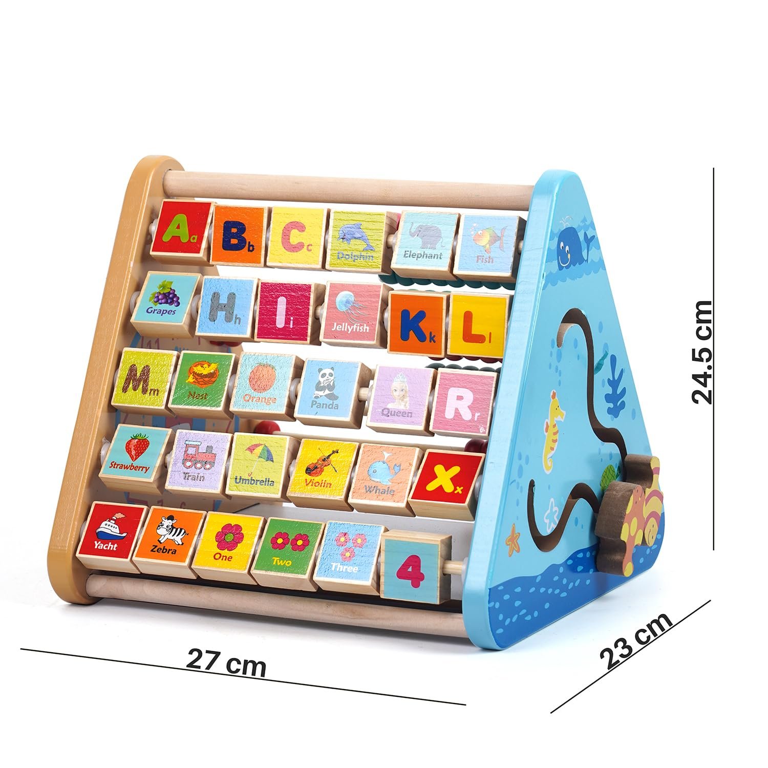 Multifunctional 5 in 1 wooden activity cube triangle: Flipping 26 alphabet blocks and four numbers blocks with pictures and English words, abacus, clock, zig zag sliding fish at 4 sides and white board at the bottom. One of the best wooden activity toys for toddlers
