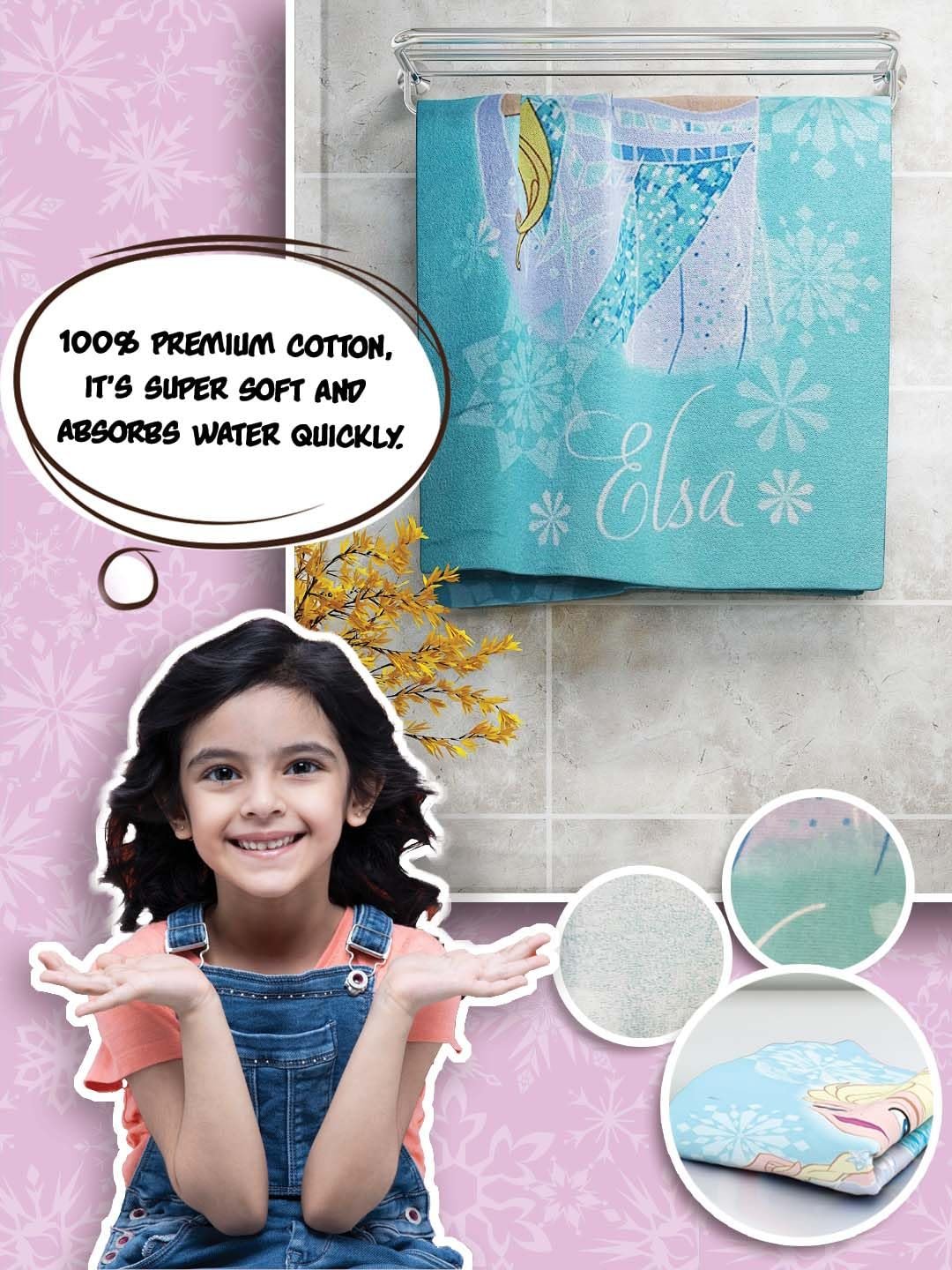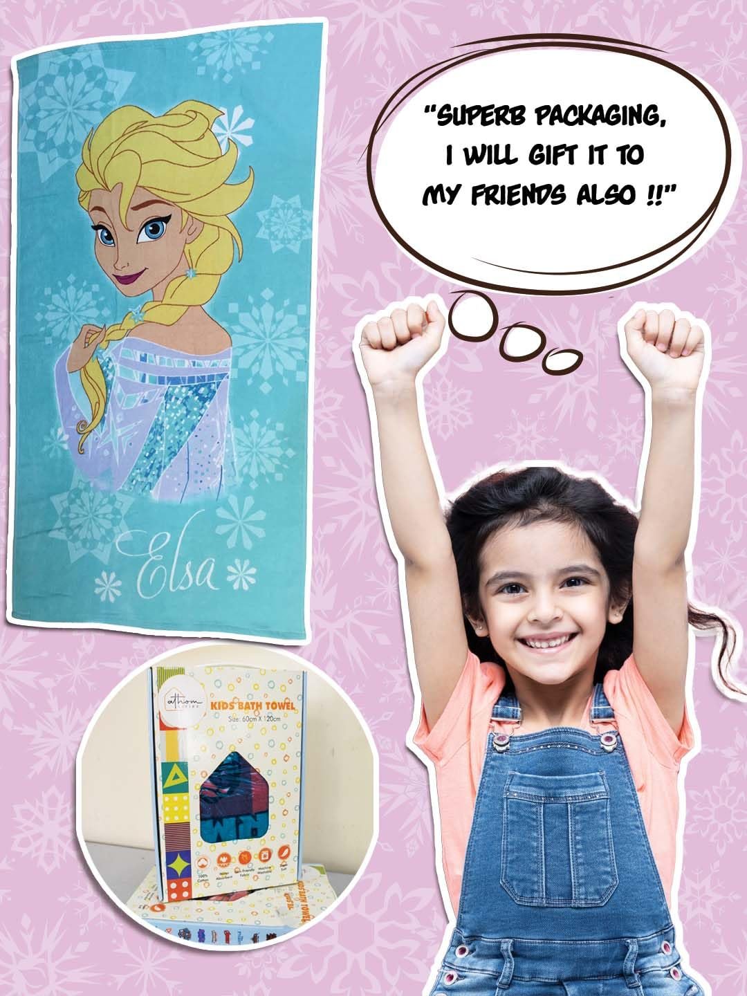 Athom Living Disney Elsa Kids Bath Towel Made from 100% cotton for softness and absorbency Features designs inspired by Disney\’s Elsa Each towel measures 60×120 cm 350 GSM for a balance of thickness and quick drying