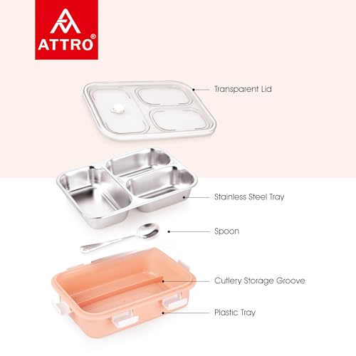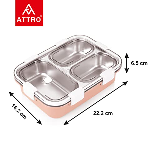 Attro Bento 3 Compartment Stainless Steel Lunch Box with Steel Cutlery Inside, Heating & Water Insulation Design Use for Office, School & Travelling, 750 Ml – Pink
