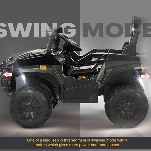 - ? Realistic Driving Experience with Feature-Packed Design: With a realistic design, this battery-operated jeep provides an authentic driving experience. Equipped with a Swing mode, horn ?, LED headlights ?, RGB On Bonnet, inbuilt music ?, Bluetooth, USB, Aux, and a remote controller ?, the jeep mimics a real vehicle. Twin butterfly doors, a hidden charging hole, and connectivity options for USB and Aux enhance the overall play experience.