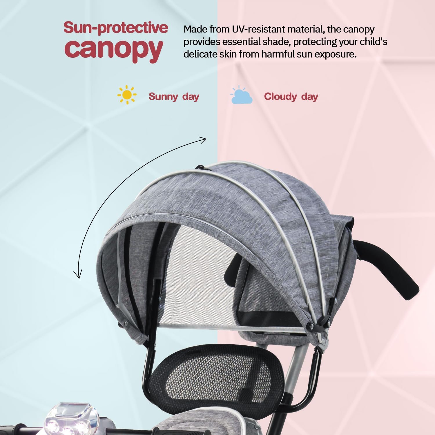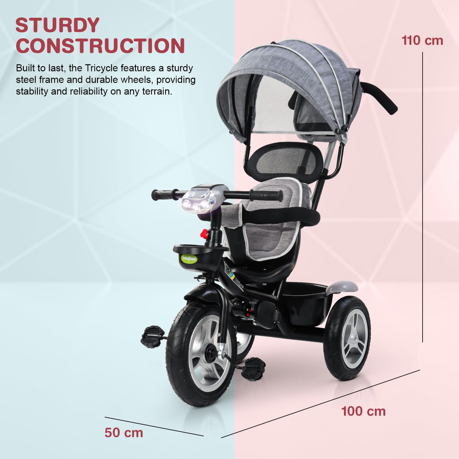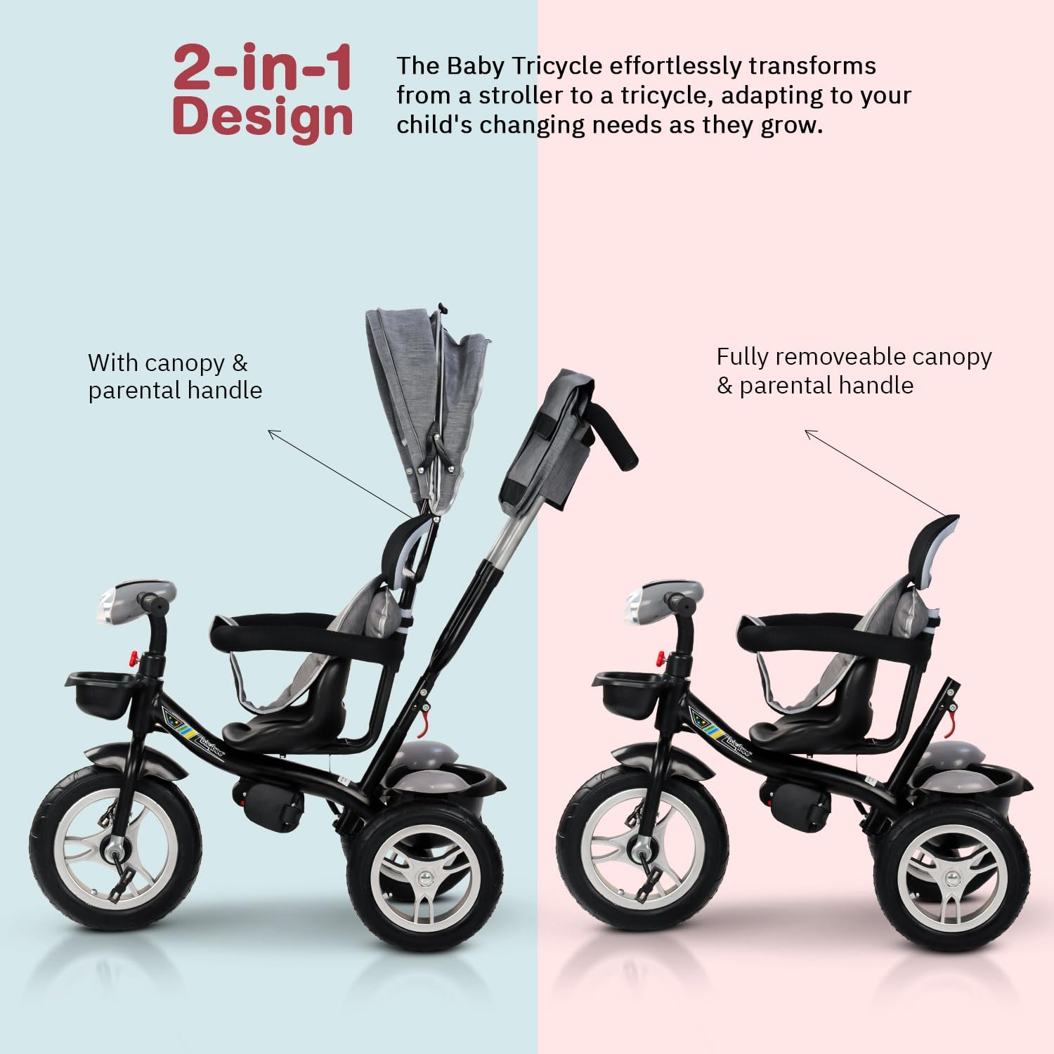 Baybee Klinto 2 in 1 Baby Tricycle for Kids | Plug N Play Baby Cycle Trikes with Parental Control, Canopy, LED Light & Music, Kid Triycle with Safety Guard, Kids Cycle for 2-5 Years boy Girl (Ash)