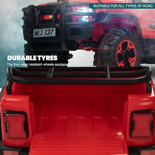 - ? Enhanced Safety Features: With a strong 4*4 motor and a gentle start function, the jeep ensures a safe driving experience. It also includes bright LED lights for improved visibility in low light conditions and a smart steering system to prevent tipping, creating a secure setting for young explorers.
