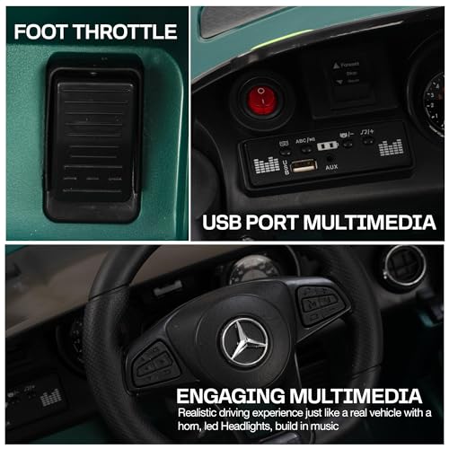 - [Realistic Car Design] Electric Car gives your kids a realistic driving experience just like a real car with led Headlights, music, USB, Aux, remote controller. You can connect a USB port, or Aux and play a wider selection of songs and stories. It has volume, Music, horn buttons & battery charge display, The charging hole is hidden to prevent water from entering it and to enhance the toy’s aesthetics.