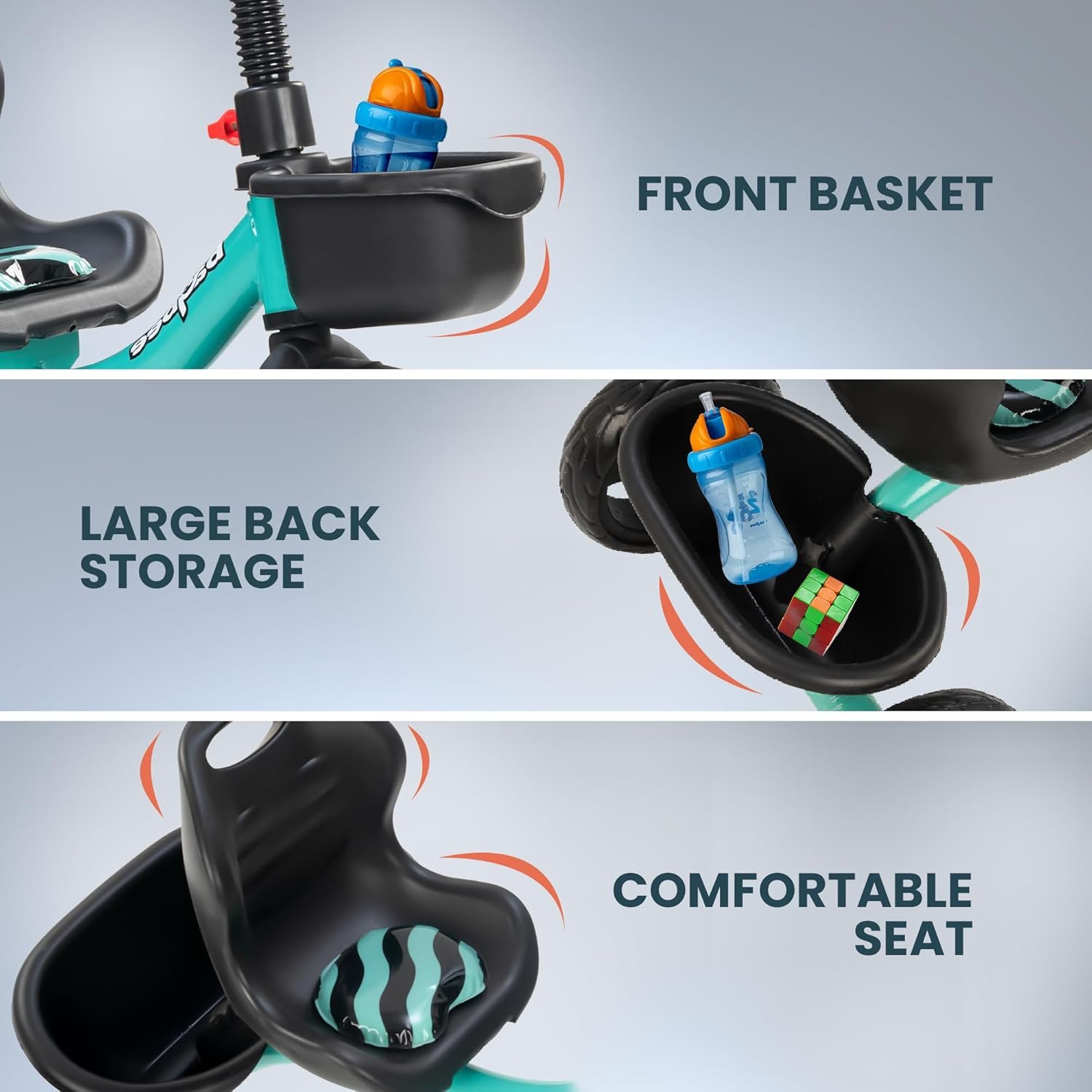 🧺 Dual Storage Baskets for Fun & Function: Equipped with front and back storage baskets, this baby tricycle is ideal for carrying toys, snacks, and mini essentials during outdoor adventures. Whether your child is headed to the park or just cruising around the block, the dual basket setup turns every ride into a fun and functional experience for little explorers.