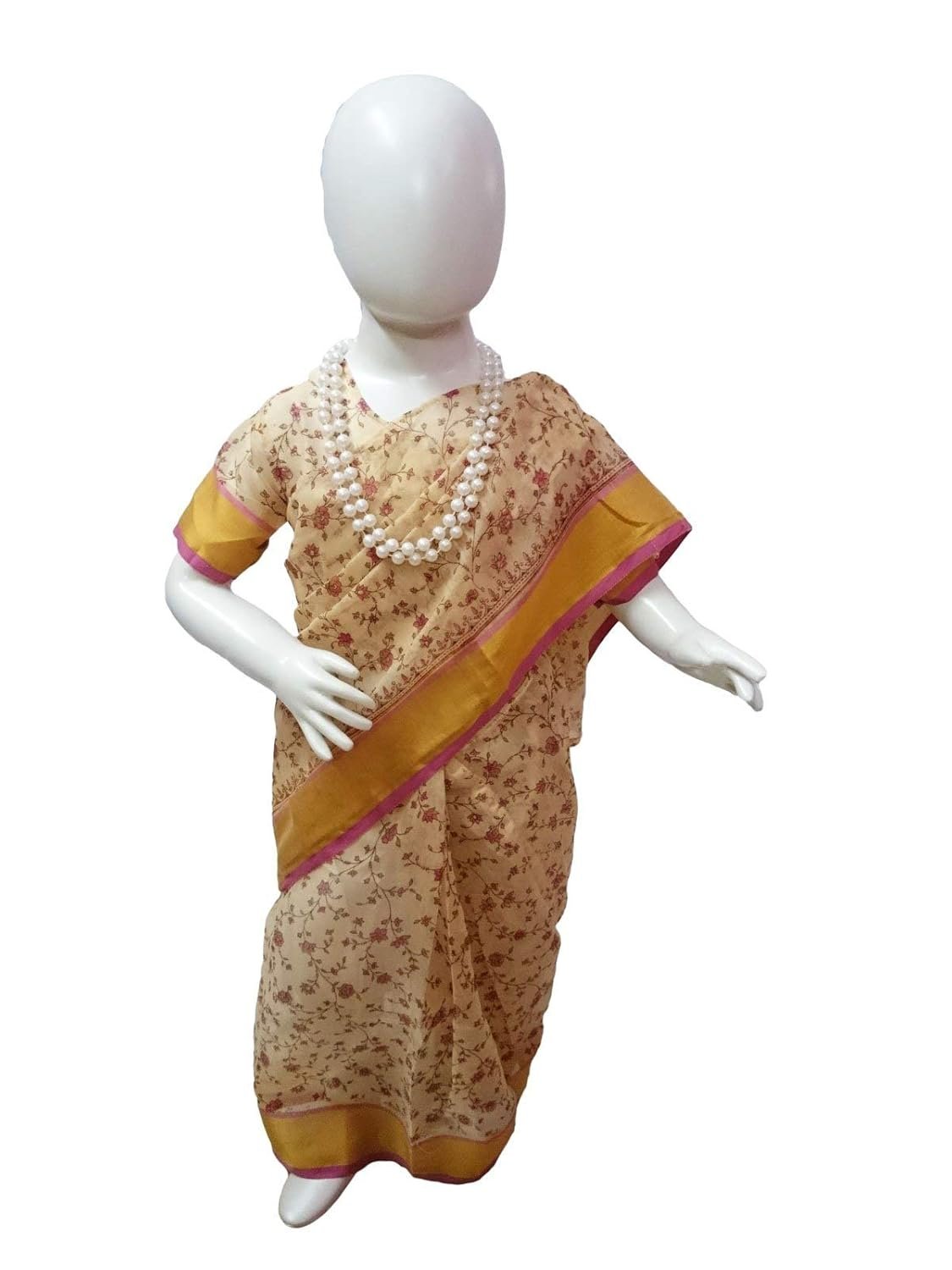 Contains a printed Saree (ready-to-wear), Blouse and a Whie Pearl Necklace Disclaimer: Cream-Pink and Cream-Green Colors. Available color will be sent.