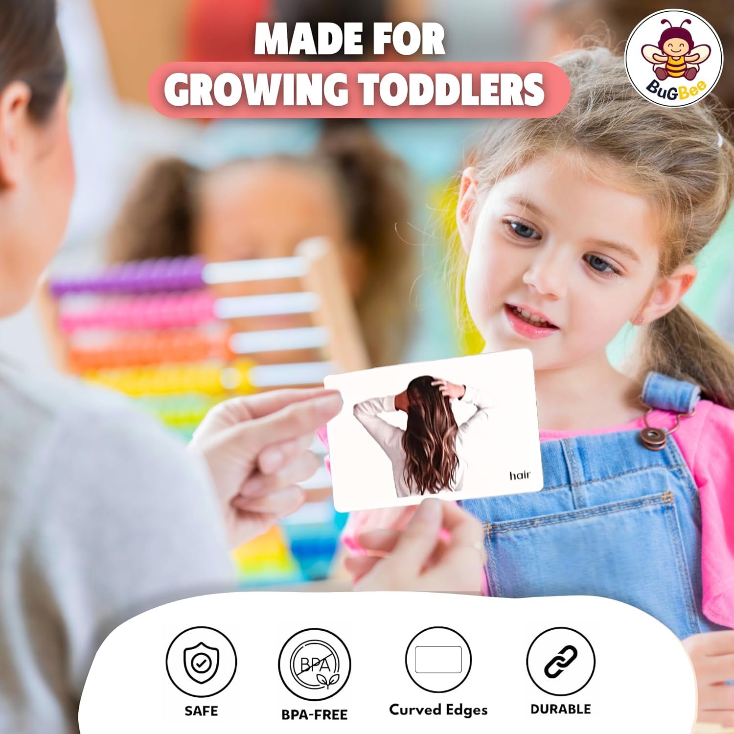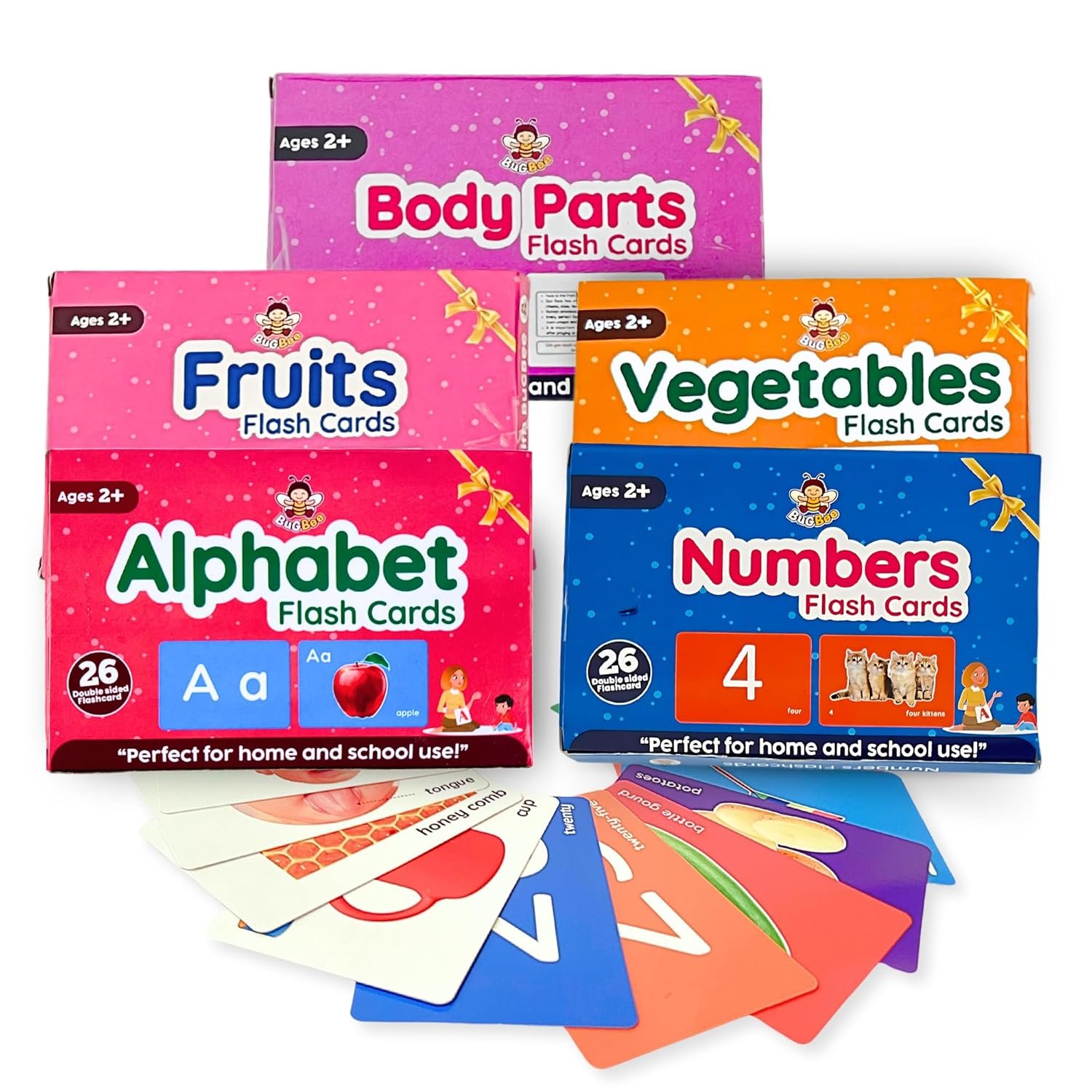 BuGBee Flash Cards for Kids 2+ Years | Montessori Toys & Games, Preschool Learning for Kids for 1, 2, 3, 4 Years (Alphabets +Numbers + Fruits + Vegetables + bodyparts Flash Cards (Set of 5)