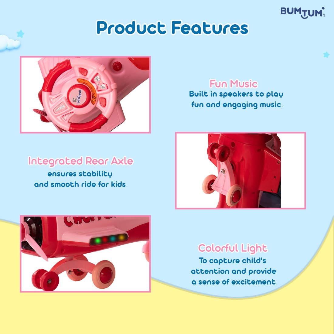 The Bumtum Helicopter swing car is made from high-quality material safe for kids of 1-5 years, this toy car comes with music, sound, lights, and has a comfortable backrest for endless hours of entertainment and adventure.