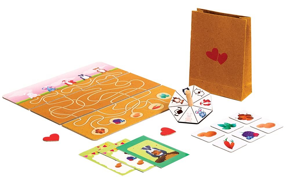 Contains: 2 animal boards, 2 ground boards, 2 food boards, 1 Wooden Spinner, 20 food tokens, 8 order cards, 2 heart tokens, 1 care paper bag. For 1 to 2 players