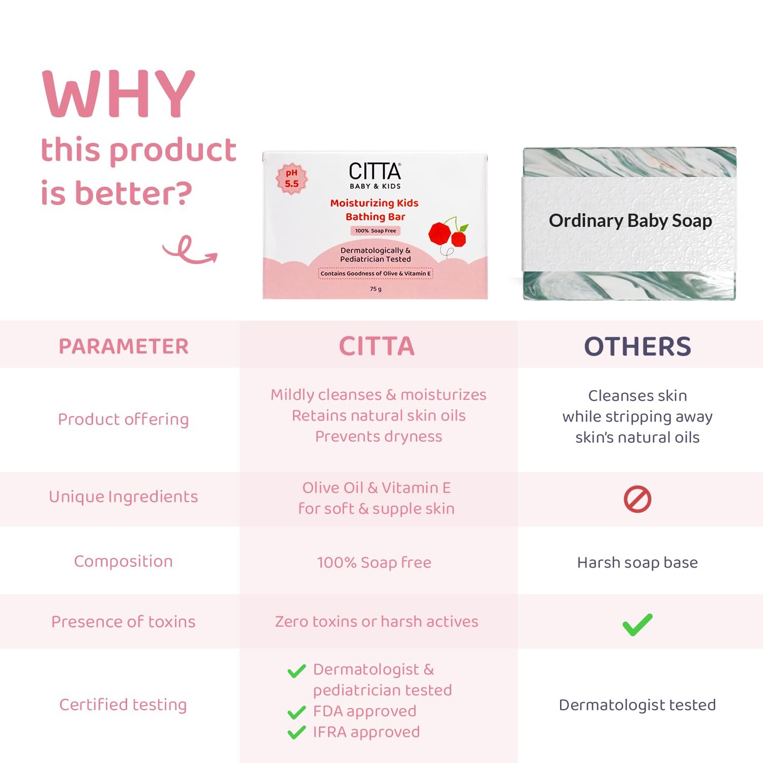 NATURAL AND NOURISHING INGREDIENTS: The CITTA Moisturizing Kids Bathing Bar is a 100% soap free and gentle bathing solution that cleanses and moisturizes your kid’s delicate skin. Unlike any other baby soap for bath, this bathing bar is formulated with carefully chosen natural ingredients like olive oil and vitamin E, which ensures a soothing bath time for your little ones!