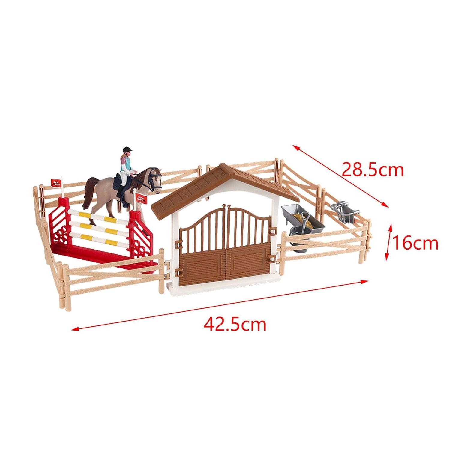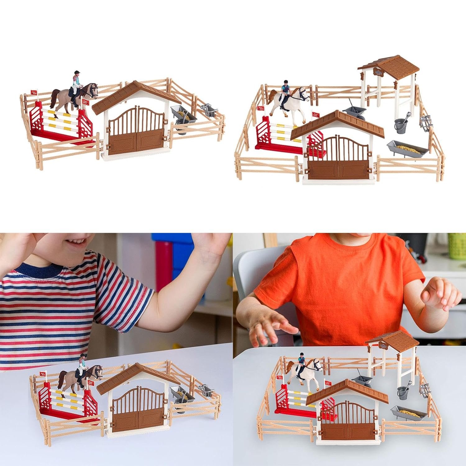 Horse Toys Set‘:Horse stable figurine playset contains a variety of accessories such as horse, horse horseman, fences, rails, feeding troughs and more, providing your child with everything they need to create their own equestrian scene.