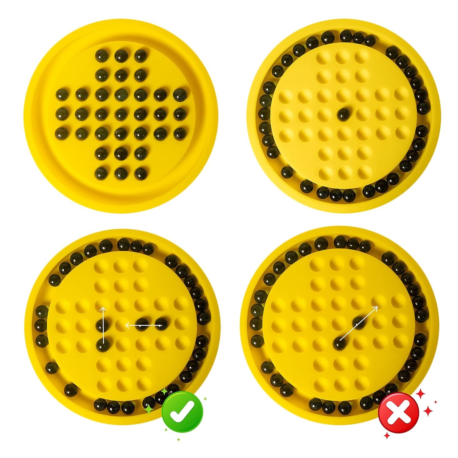 Rules to Play: 1) Place marbles on the board leaving center hole vacant. 2) Move one marble over the other either horizontally or vertically (diagonal moves not allowed). 3) As soon as you do this, the marble over which you took the other marble has to be removed. 4) Continue moving one marble over the other till you have no option left. 5) The aim of the game is to leave only ONE marble on the board.