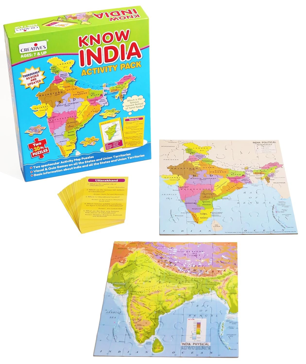 ✔️【 JIGSAW PUZZLES 】: – In the Creative’s Know India Activity Pack the child will put together 30 pieces each of (i) India political and (ii) India physical map puzzles those show locations of States, Capitals, Rivers, Mountains, Plains and Water Bodies etc.