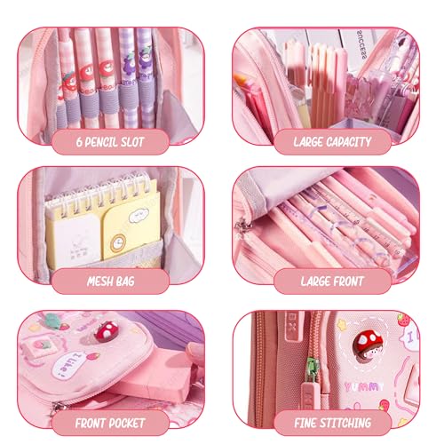 FINEMOE Canvas School Bag Pencil Case, 3 Layer 6 Compartment Large Capacity, Aesthetic Pencil Pouch for Stationary, Cute Stationery for Kids, Pencil Case for Girls & Boys, Gift for Children (Pink)