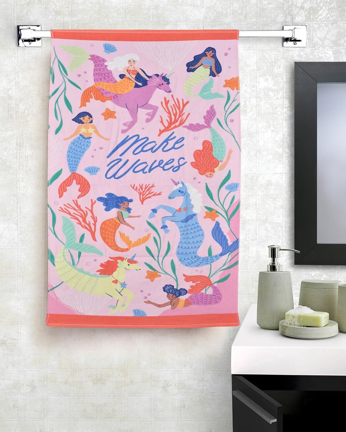 SIZE – 27×54 Inch. Engaging Cartoon Prints: The Fresh From Loom bath towel features captivating cartoon prints that ignite children\’s imagination and make bath time more enjoyable. These prints include a variety of beloved characters and playful designs, making drying off after a bath a fun and exciting experience. By incorporating engaging visuals, this towel encourages children to look forward to bath time. The vibrant colors and charming designs stimulate creativity and add an element of joy