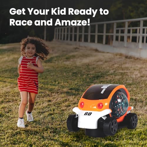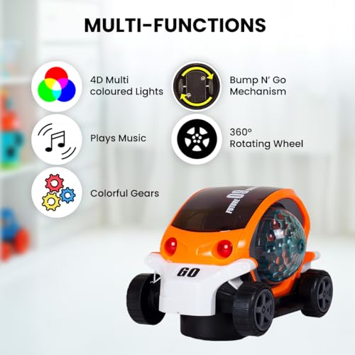 Gooyo GY149A Battery Operated Stunt Car Toy with Music & 4D Vibrant Light Effects | 360° Rotating Bump & Go Action Car Toy| Orange Color, Power Source: 3xAA Battery (Not Included)