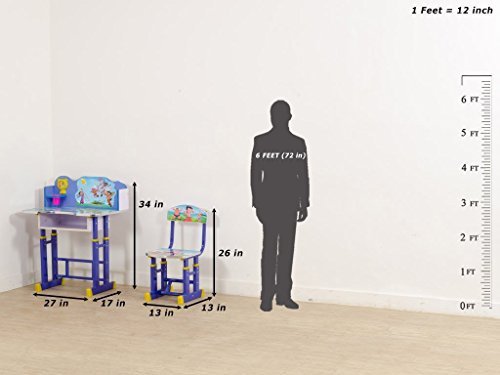 - HOMIES INTERNATIONAL Height Adjustable Multiple Cartoon Printed study table and Chair set, with Table Clock and Pen / Pencil Holder Cup for Kids. Material: Wood and Steel. Dimension: (H) 59 x (W) 43 x (L) 68 cms. Color: PINK.