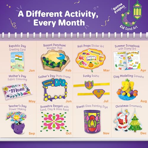 • ONE PROJECT, EVERY MONTH: January – Republic Day Greeting Card, February – Basant Panchami Wooden Thali, March – Holi Props Sticker Art, April – Summer Scrapbook with Stamp Art, May – Mother's Day Fabric Coloring, June – Father's Day Photo Frame, July – Funky Rakhis, August – Clay Modelling Ganesha, September – Teacher's Day Flower Making, October – Dussehra Rangoli with Sand, Clay & Glass Paint, November – Diwali Glass Painting Diya, December – Christmas Ornaments & a Bonus Project: Eid – Sand Art Lanterns.