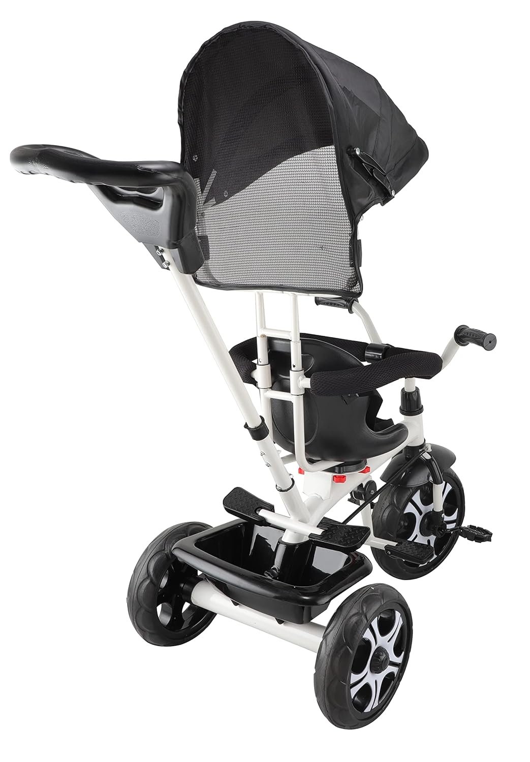 DURABLE MATERIAL: This push trike is made with heavy duty magnesium-aluminum alloy frame and has superior strength. Lightweight, anti-corrosion and anti-peeling. Adjustable canopy with 600D oxford fabric blocks harmful UV rays. Mesh screen for ventilation.