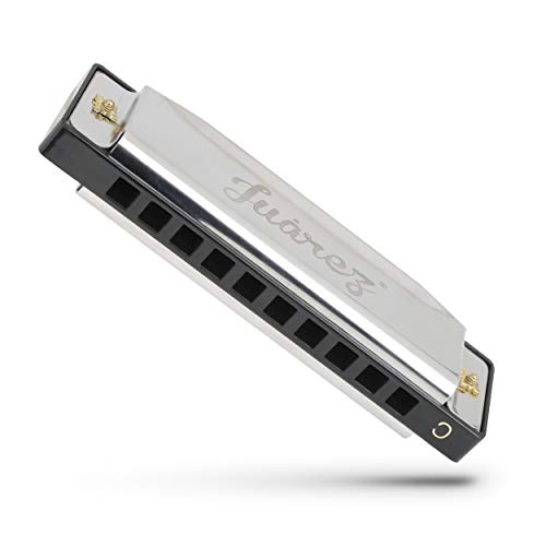 Juarez JRZ10HM Key C Diatonic Blues Harmonica 10 Hole 20 Tones with Case, Mouth Organ for Beginners, Students, Kids & Professionals, Silver
