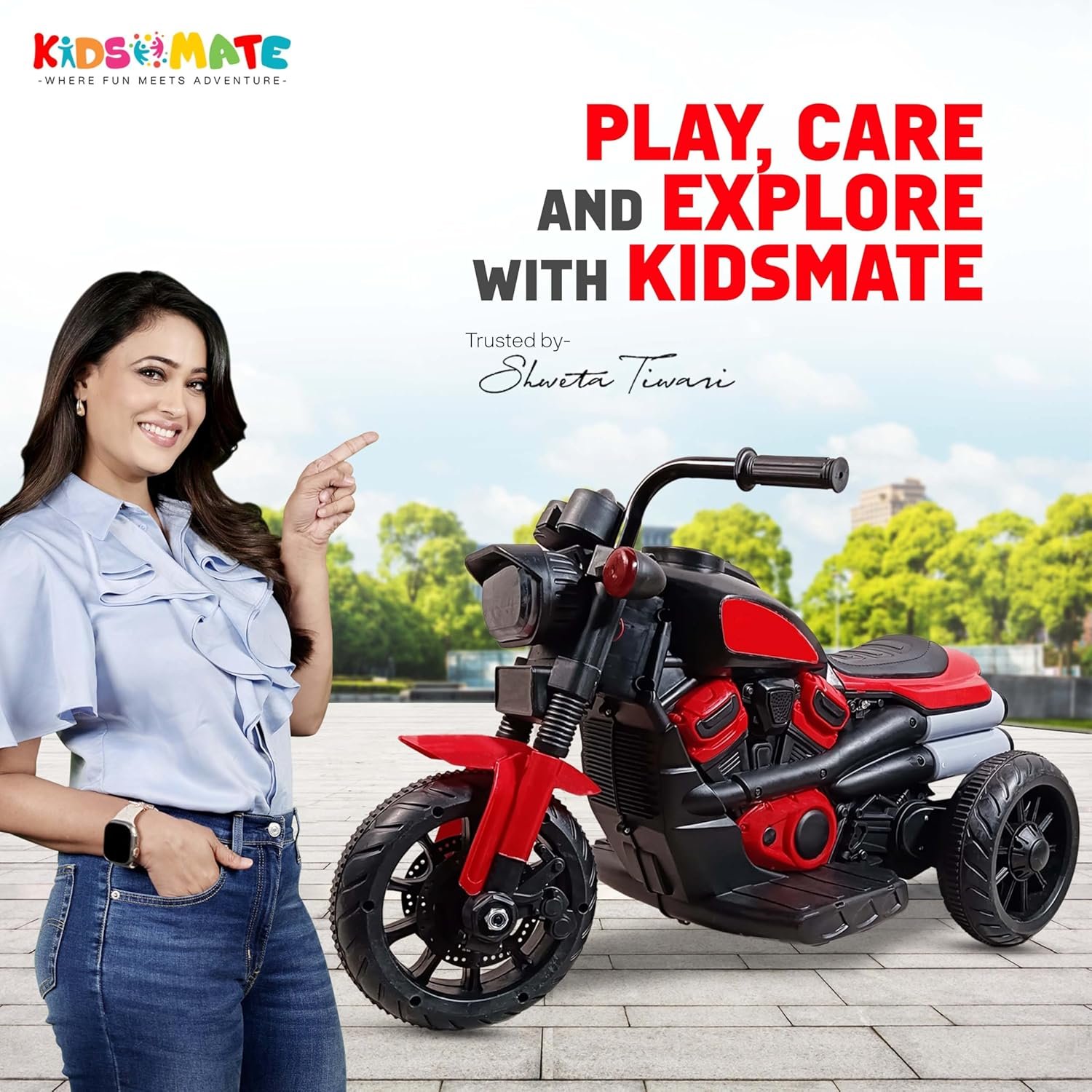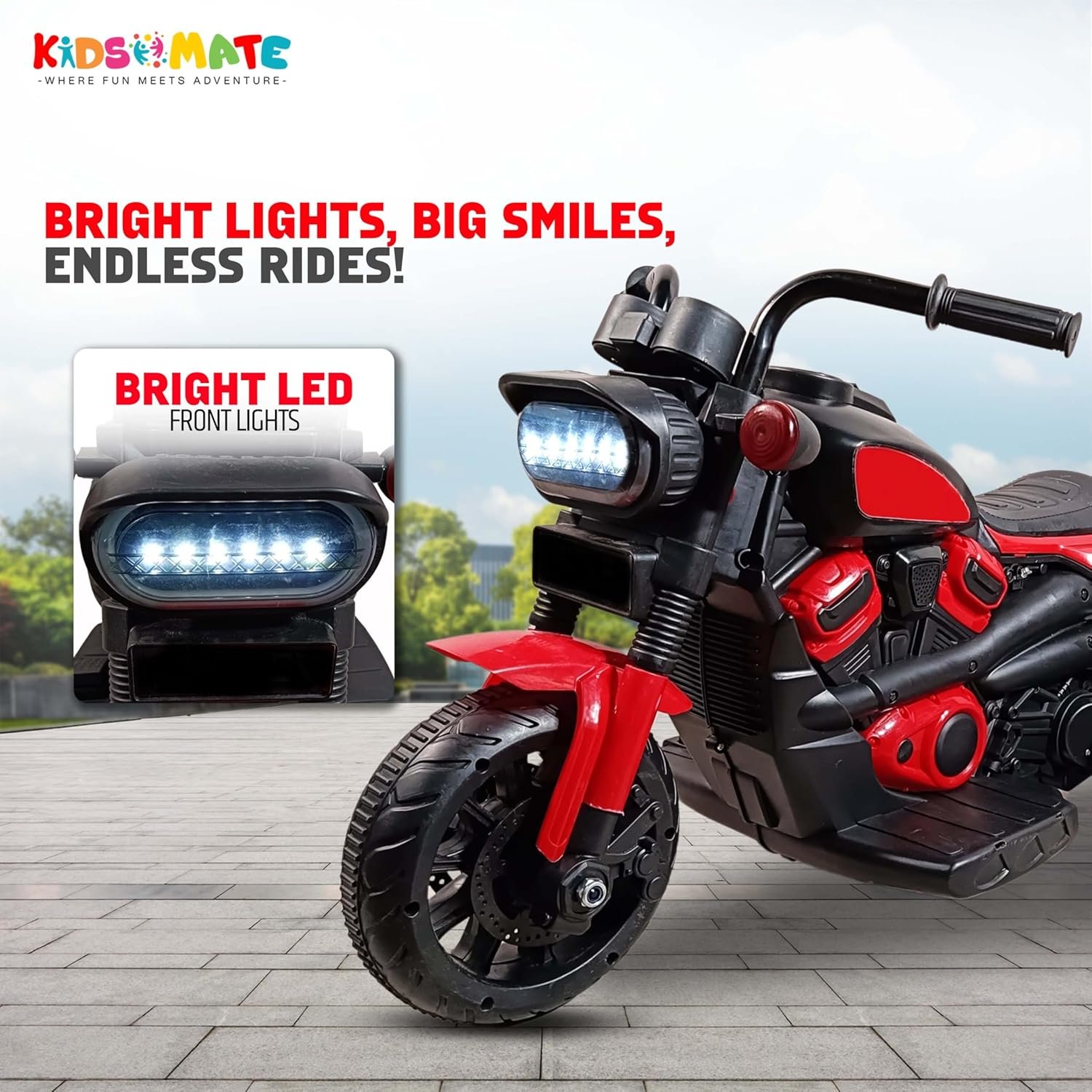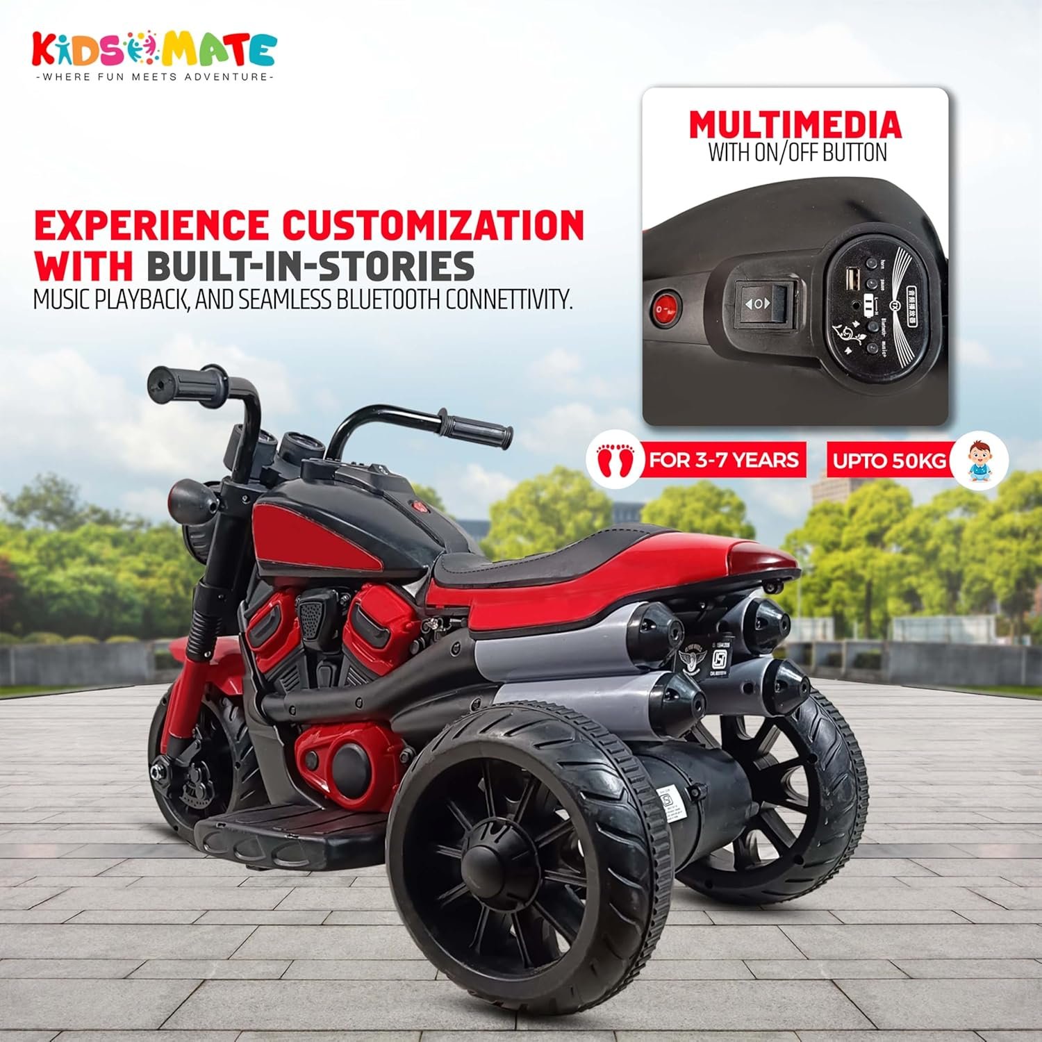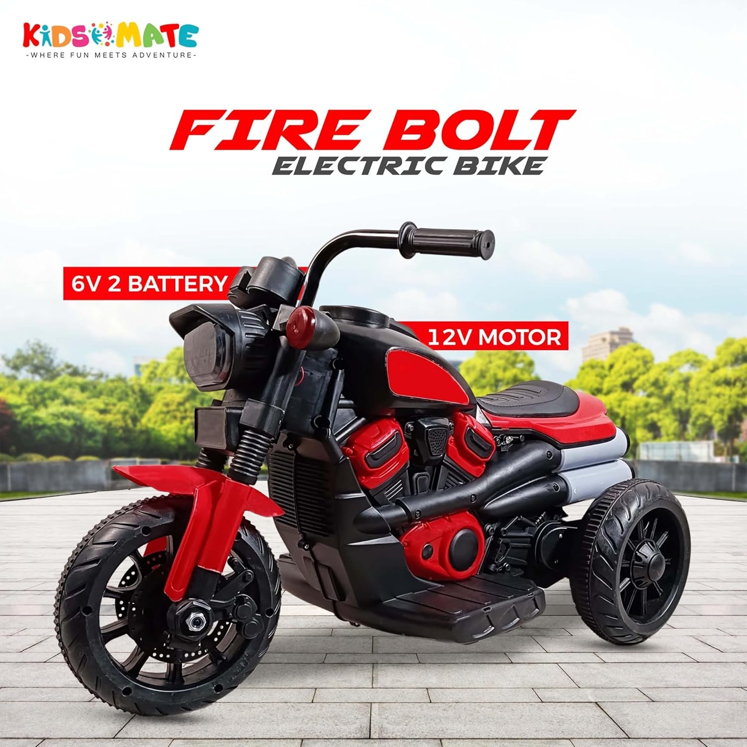 Kidsmate Fire Bolt Electric Bike for Kids | 3-Wheel Battery-Operated Ride-On Kids Bike| Battery Bike with MP3, USB & Bluetooth | LED Lights, Horn | Safe & Fun for Ages 1-5 Yrs – Red