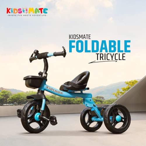 Kidsmate Foldable Tricycle for Kids | Sturdy & Durable Baby Trikes with Storage Basket, Cushion Seat & Safety Belt | Baby Tricycle for 1-4 Years Boys & Girls | Weight Capacity Upto 30kg (Blue)