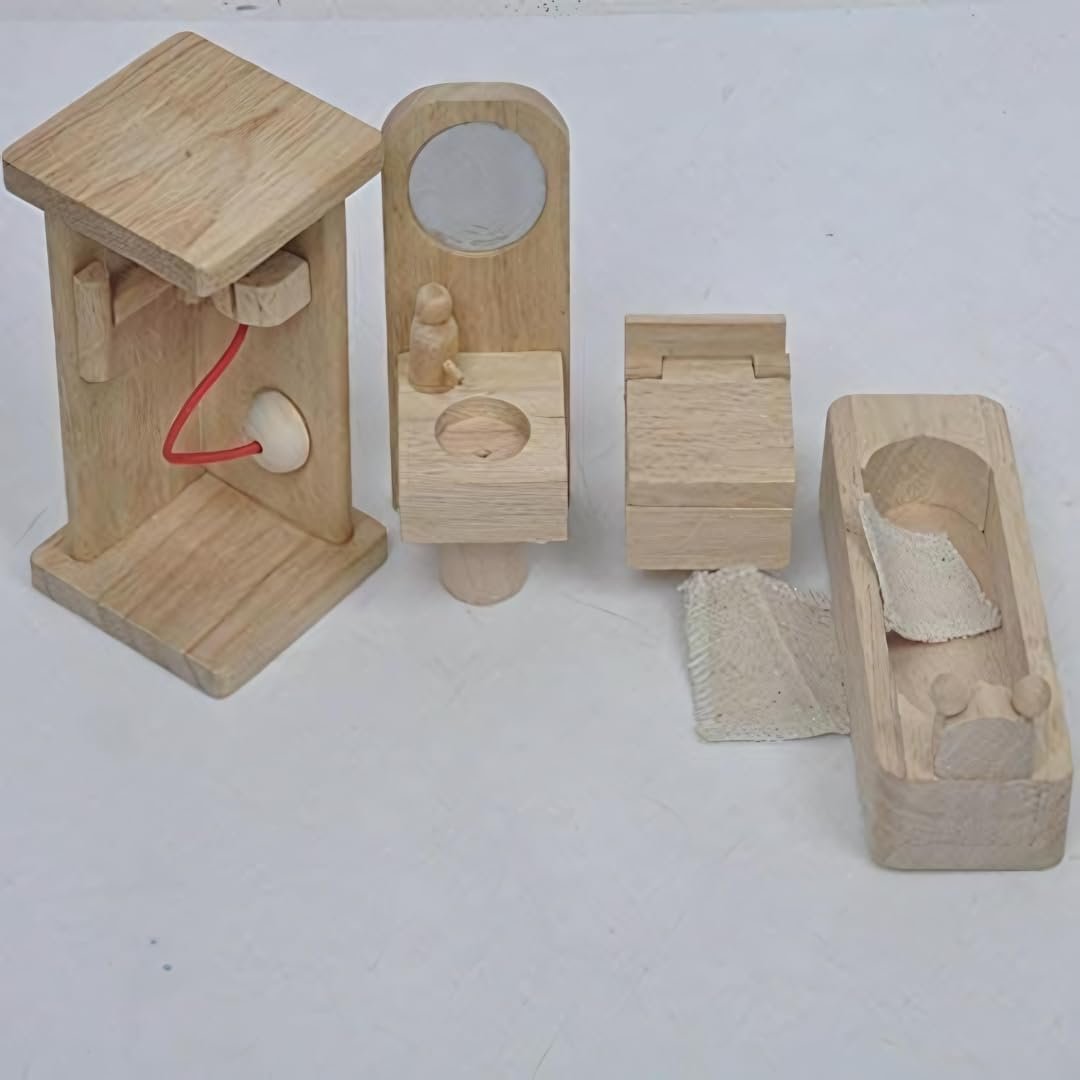 Complete Bathroom Set: Includes a bathtub, toilet, sink, mirror, and towel rack, perfect for dollhouses or imaginative play.Classic wooden design that complements any dollhouse and remains a favorite toy for years.