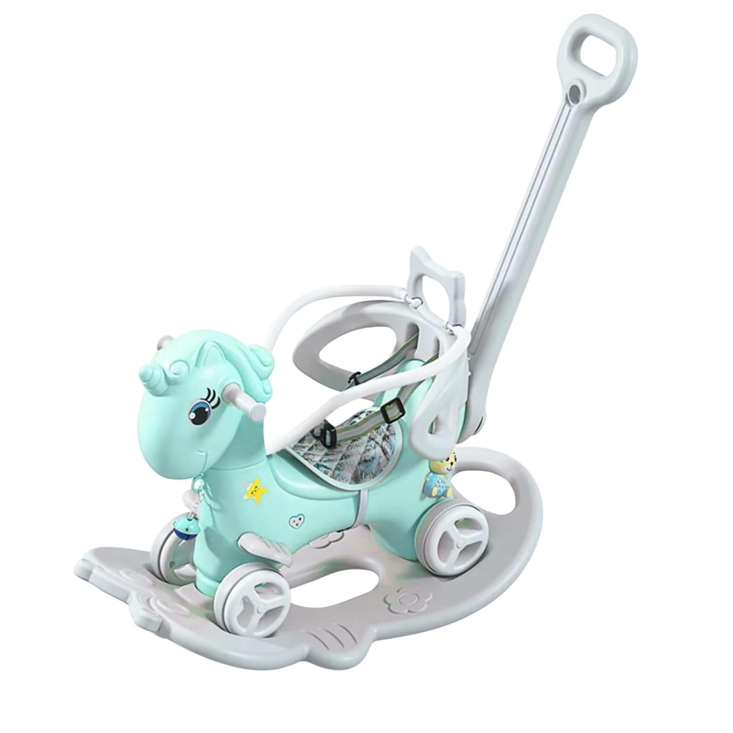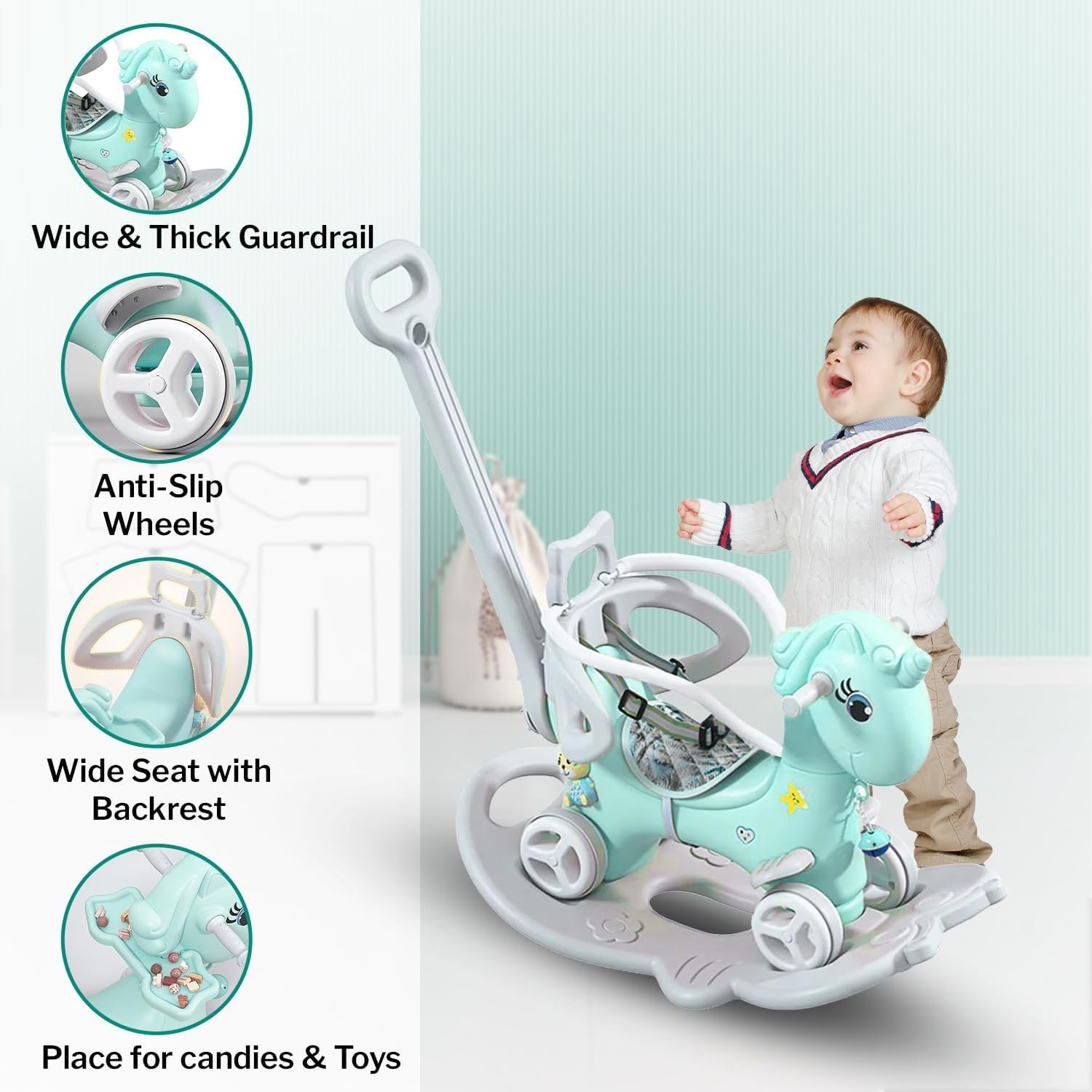 4-in-1 Ride On Toy: LET’S PLAY Rocking Horse transforms into a ride-on car, balance board, and stroller for Kids. It helps in child’s development by enhancing their balance, coordination, and motor skills.