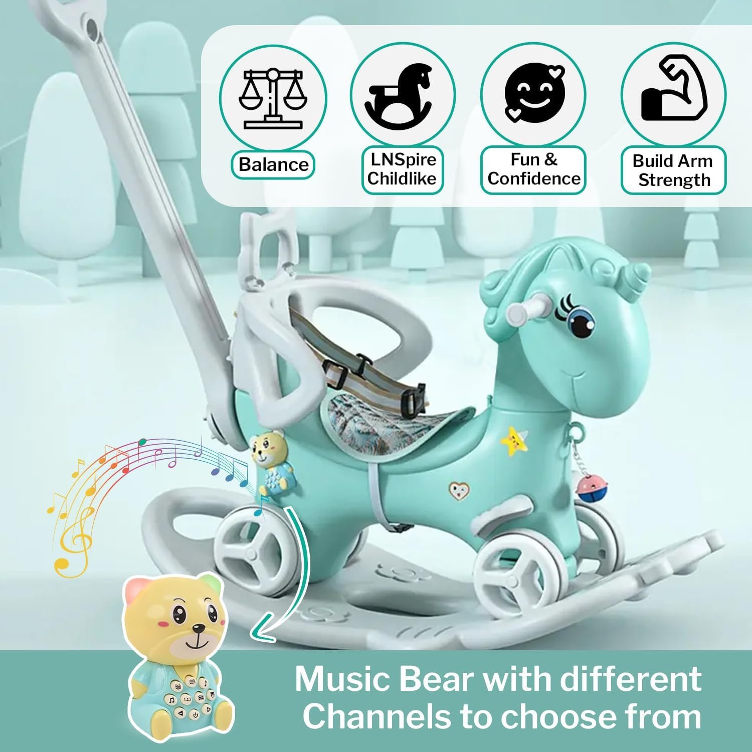 LET\’S PLAY New 4 in 1 Rocking Horse for 1-3 Year Old Kids, Baby Horse Rocker Ride on Toy with Detachable Balance Board, Music Bear & Safety Belt – Birthday Gift for Toddlers (Neon Blue)