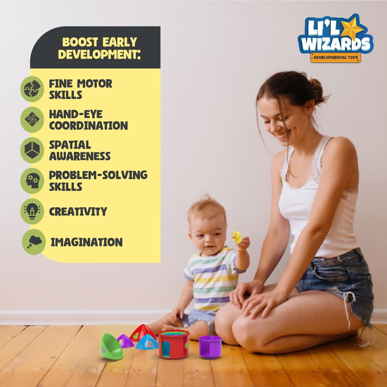 Cognitive Development: Introduce spatial awareness and the concept of cause and effect in a