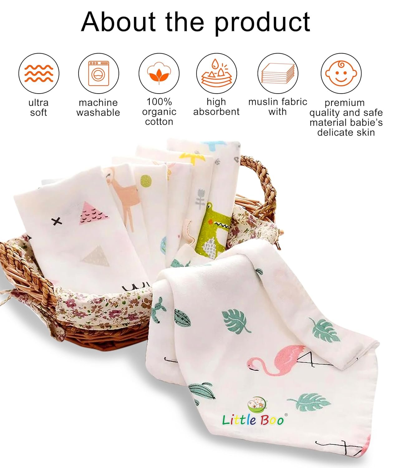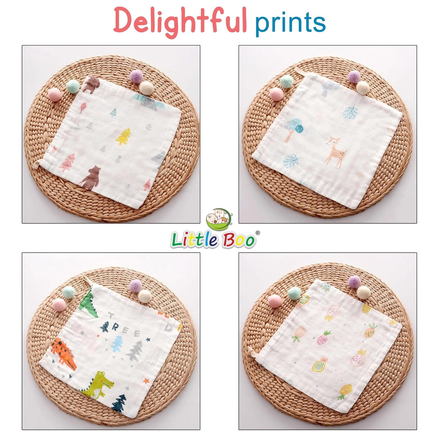 Little Boo Muslin Face Hankies/Towels for Newborn Baby Extra Soft Reusable Napkins for Infants Toddlers/Kids (Pack of 5) White Printed.