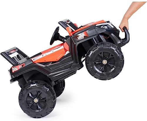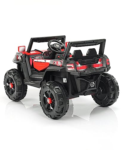 • ??Big In Size Monster Buggy?Driving the Children SUV Car Shake 2 motor .The ride-on's large, open cockpit area with seat belts for safety. A realistic dashboard features a USB music socket, music and horn button so your little one can pretend to drive just like you. Spare Tyre (dummy) at the back of the seats ignite your child's sense of adventure. 2.4ghz Remote allow parent to control the Electric Car in longer distance and without interfere by other electric children car's channel.
