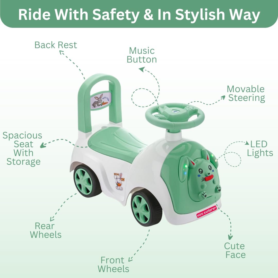 MiniExplorer Rabbit Ride On & Toy Car for Kids with Music & Horn Steering, Push Car for Baby with Backrest, Safety Guard, Under Seat Storage & Big Wheels | Ride On for Kids 1 to 3 Years – Green