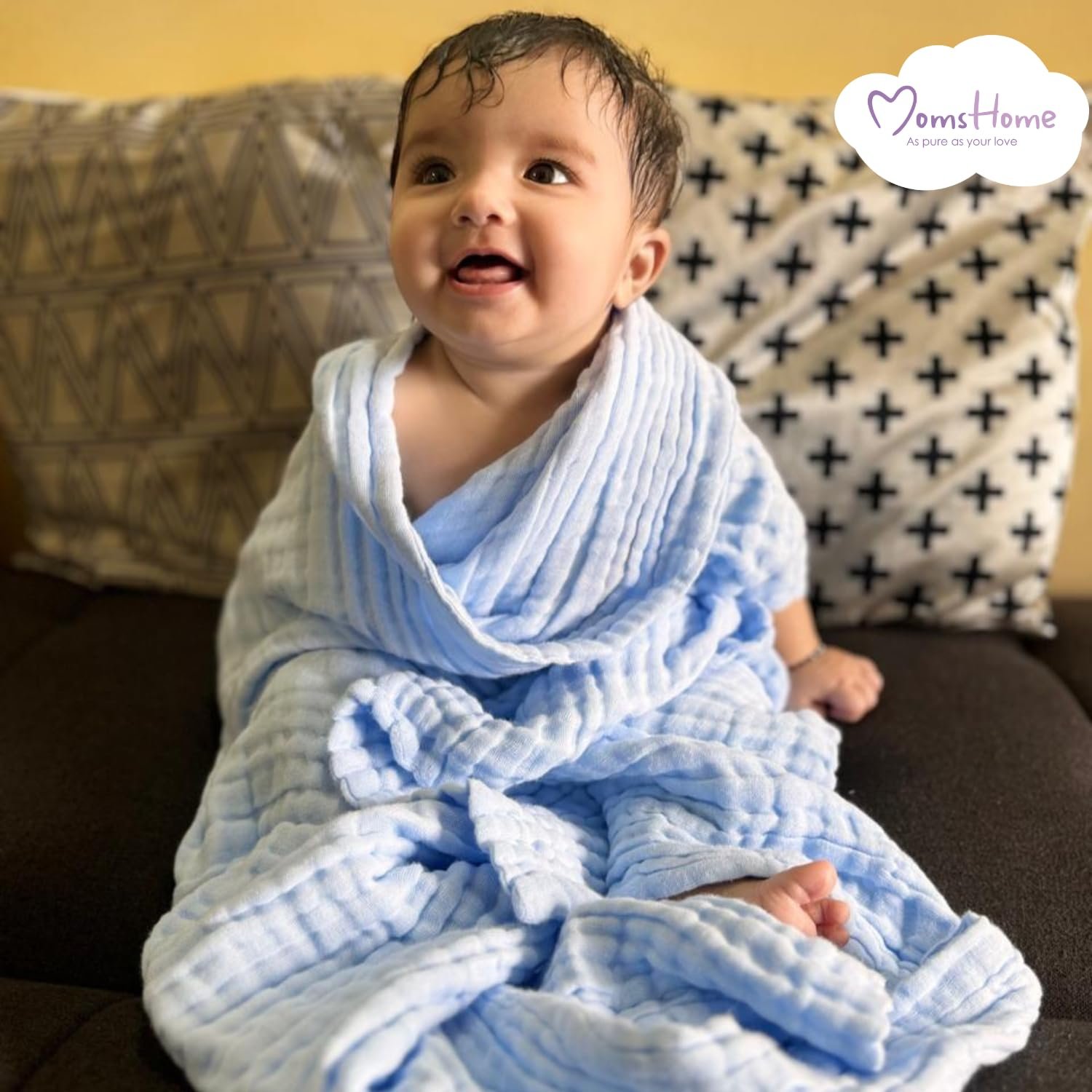 MOM\’S HOME Baby Super Soft Absorbent Muslin 6 Layer wash Towel- 100X100 CM – | 0-3 Years | Blue