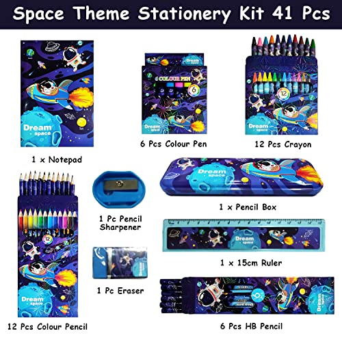 - STYLISH GIFT SPACE STATIONARY KIT FOR BOYS – This is a stylish space stationary kit set for boys. The pack includes 1Pc space notepad, 1pc space pencil box, 1set crayons (12pcs), 6pcs HB pencil, 1pc scale, 1set colour pencil (12pcs), 1set colour (6pcs), 1pc space rubber, 1pc sharpener set for kids stationary kit. These are the must have school things statinary items for kids.