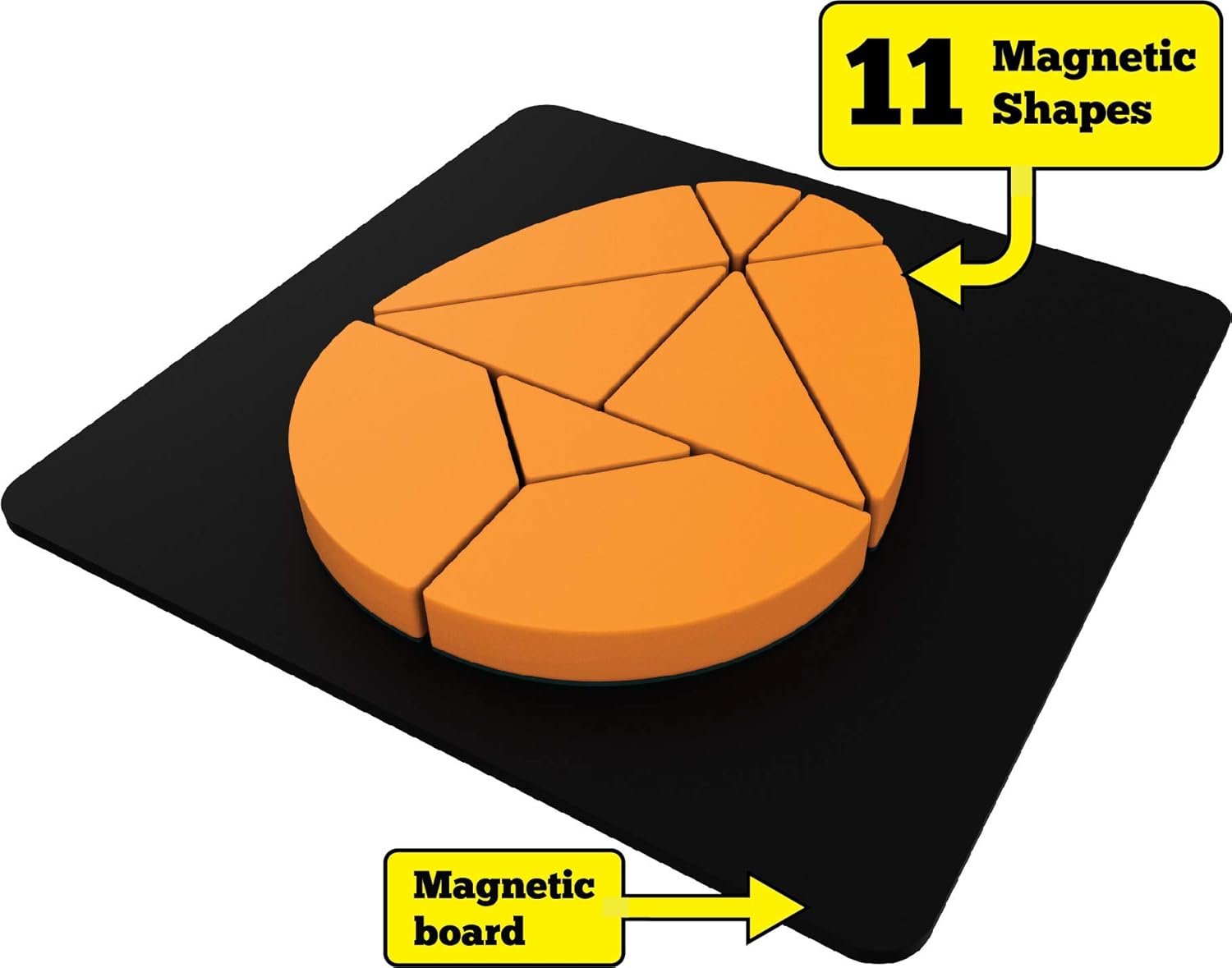 Each set includes 11 Magnetic shapes, a magnetic canvas (7X7 inches), a puzzle book with 56 puzzles, a solution book with 56 solutions.