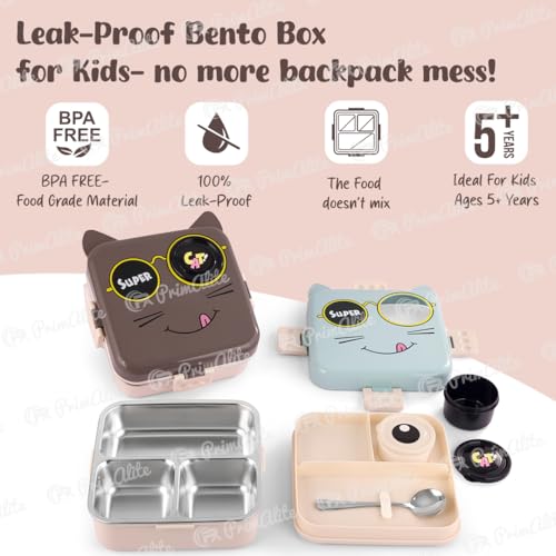 Primalite Kids Super Cat Theme Stainless Steel Bento Lunch Box for School, 3-Compartment with Sauce Jar & a Spoon, Leak-Proof Seal-Ring Design & Multiple Lock-Design Tiffin, Air-Tight- 1100ML Grey