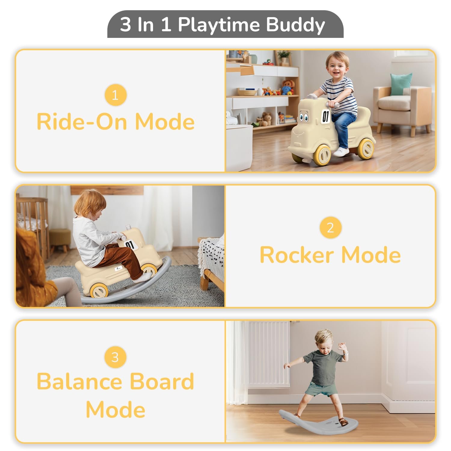 R for Rabbit Rock N Ride 3 in 1 Baby Push Ride-On Car with Rocker & Balance Board Mode | Non-Toxic, Durable and Safe Rocking Horse Rider for Kids 1-4 Years Age, Upto 20kgs Weight (Beige Grey)