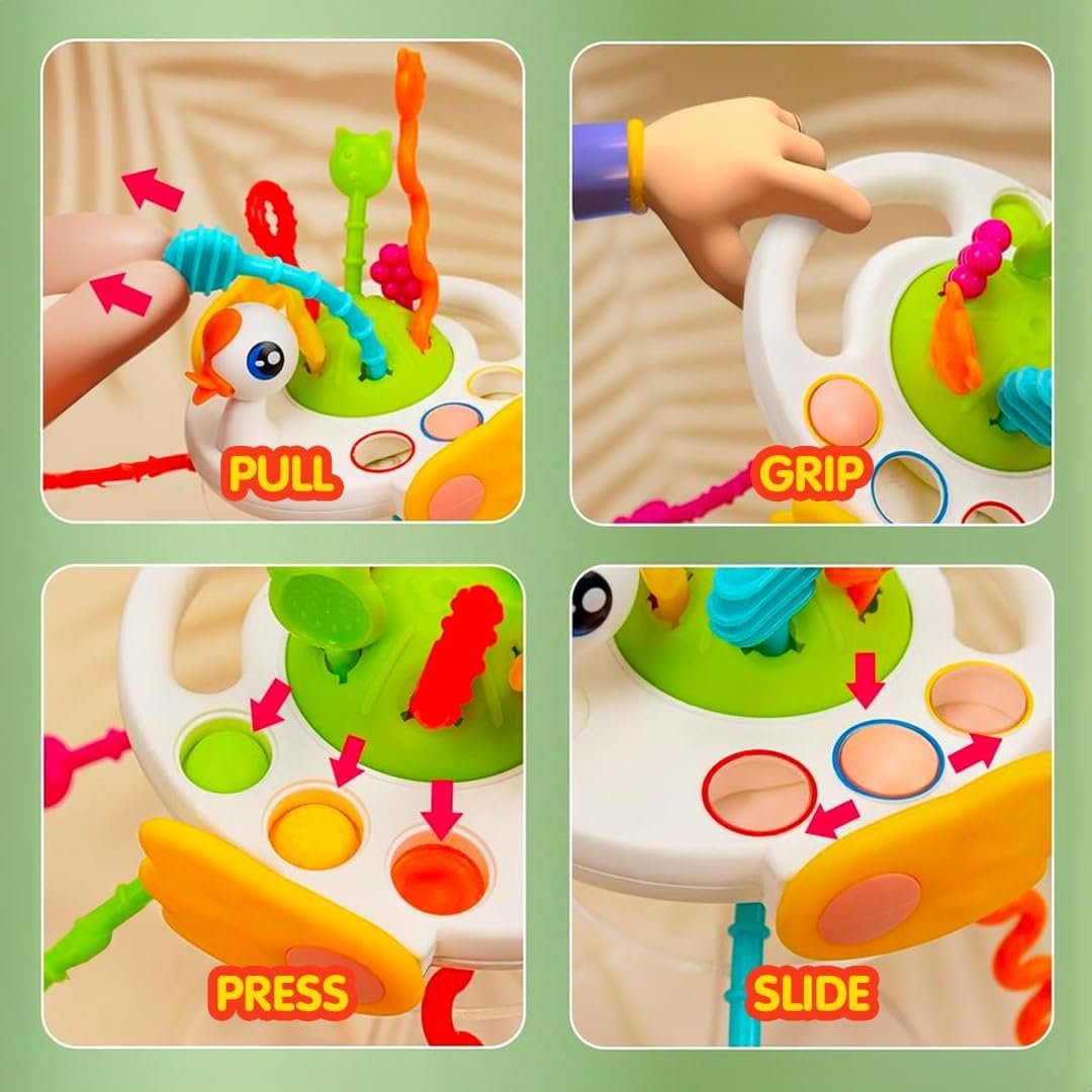 Engaging Sensory Play: Features vibrant colors, textured silicone strings, and fun pull mechanisms to stimulate sensory and motor skills.