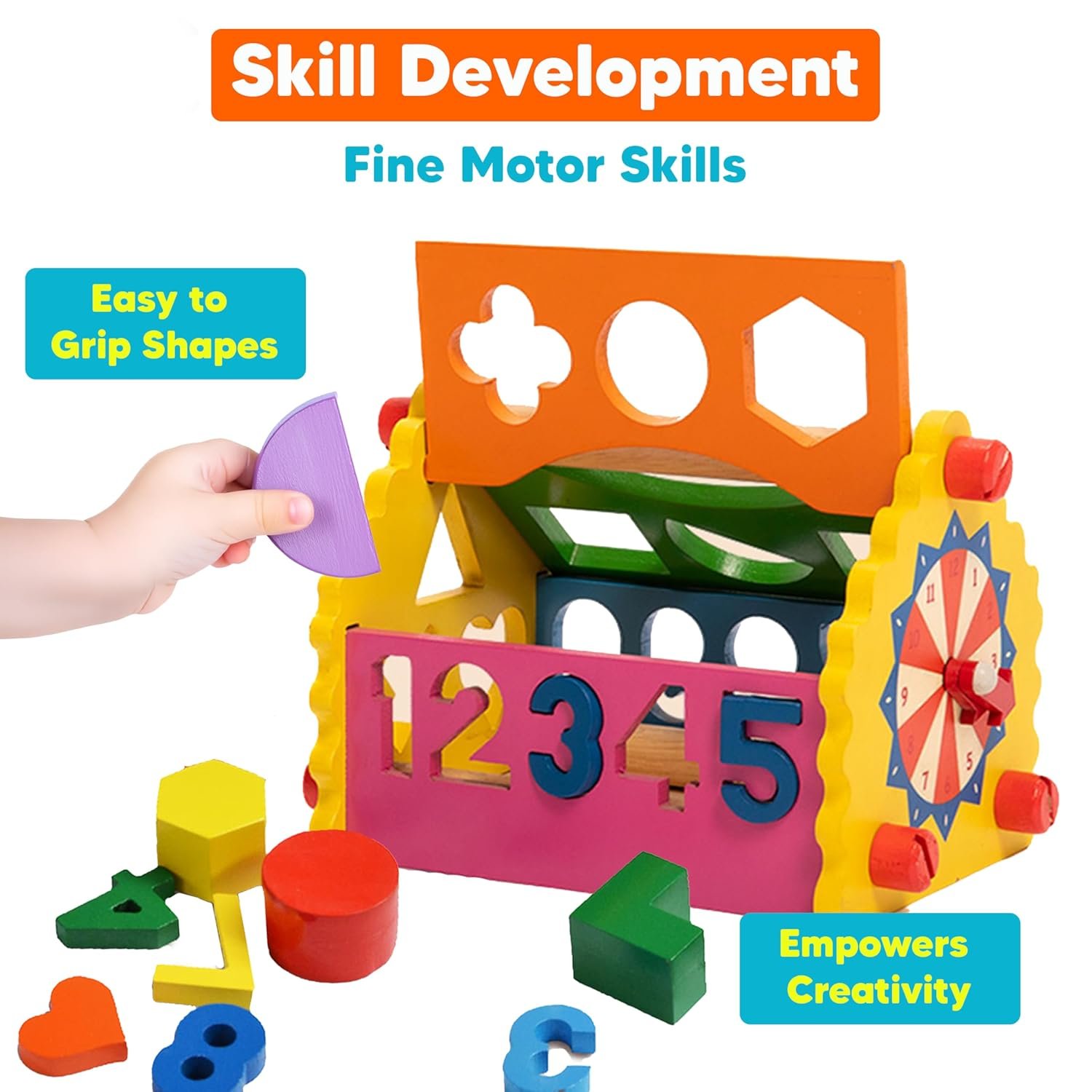 shumee 6-in-1 Wooden Shape Sorter Activity Toy (1+ Years) | Multicolor | Learning for Alphabets, Numbers, Time & Shapes | Educational Toddler Toy | Made in India